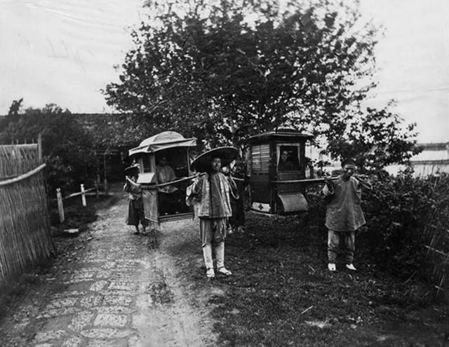 这是一张记录清代民间轿子作为代步工具的日常画面。画面里有两顶由轿夫肩扛的轿子;抬轿的轿夫身着短打服饰,是当时普通劳动者的装扮。 他们身后是乡村的石板小路,旁有篱笆、树木,植被茂盛——这类窄路恰好适配轿子的灵活通行,清代民间轿子比车马更适合在非官道的小路上行进,是当时常见的代步方式之一。