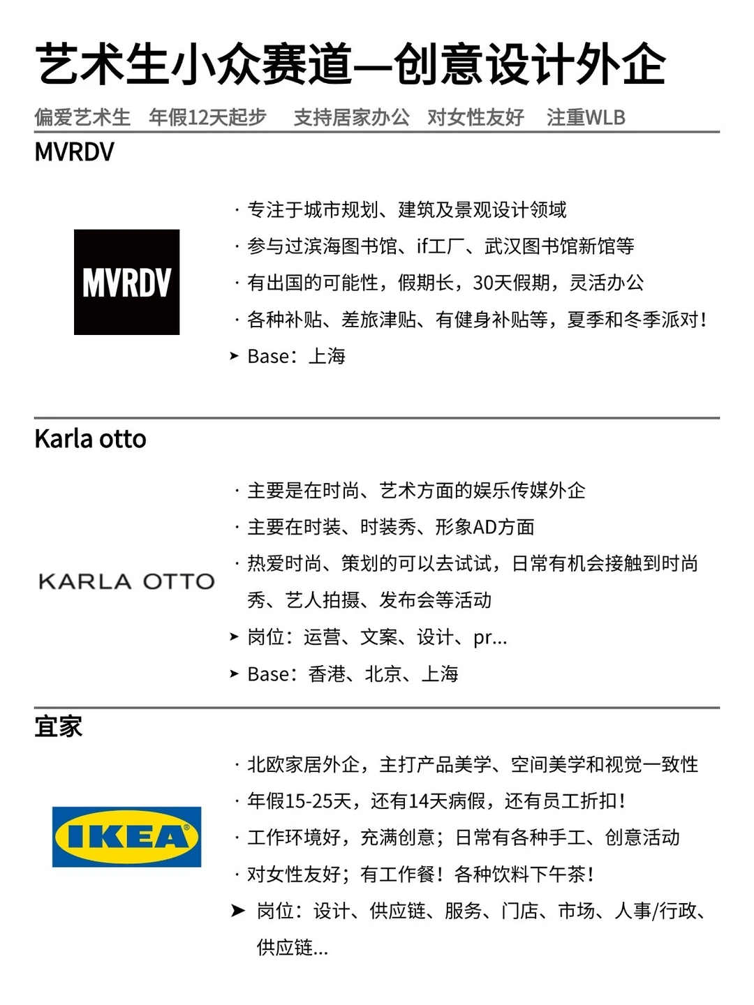 很多艺术生都觉得毕业以后能干的事不多,但其实外企里的创意岗,才是真正懂艺术生的地方,重审美、重作品、不卡专业、团队本来就有不少设计背景的同事,氛围也更平等、开放。 · 为什么艺术生值得去创意外企? ▪️对女性友好,氛围好,轻松实现wlb ▪️假期丰富,年假基本上10天起步、圣诞假、生日假... ▪️弹性工作制度,有居家办公的机会! · 坚持日更✊,帮大家在找工作路上顺利拿到offer! ·