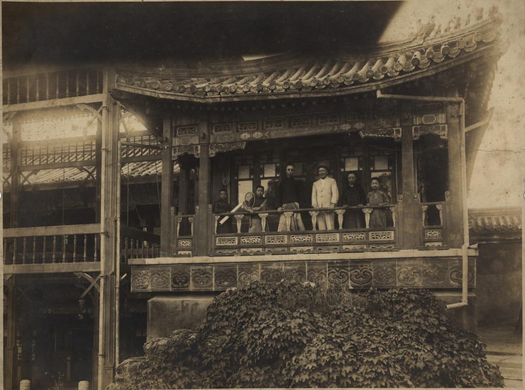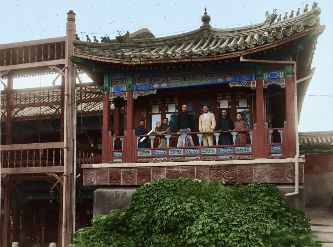 这张照片拍摄于紫禁城西路的养性斋楼上,记录了20世纪20年代逊清小朝廷时期,溥仪、其弟溥杰、婉容之弟润麒,与英文教师庄士敦(身着白色西装者)的休闲合影。 养性斋是紫禁城西路的传统宫廷建筑,原本是皇家休憩场所,逊清时期成为溥仪与近支宗室、帝师日常活动的空间之一,照片里出现的网球拍,是庄士敦引入的西方休闲方式——他将网球、自行车等西式活动带进紫禁城,让逊清小朝廷既保留传统宫廷空间,又融入了现代生活元素。