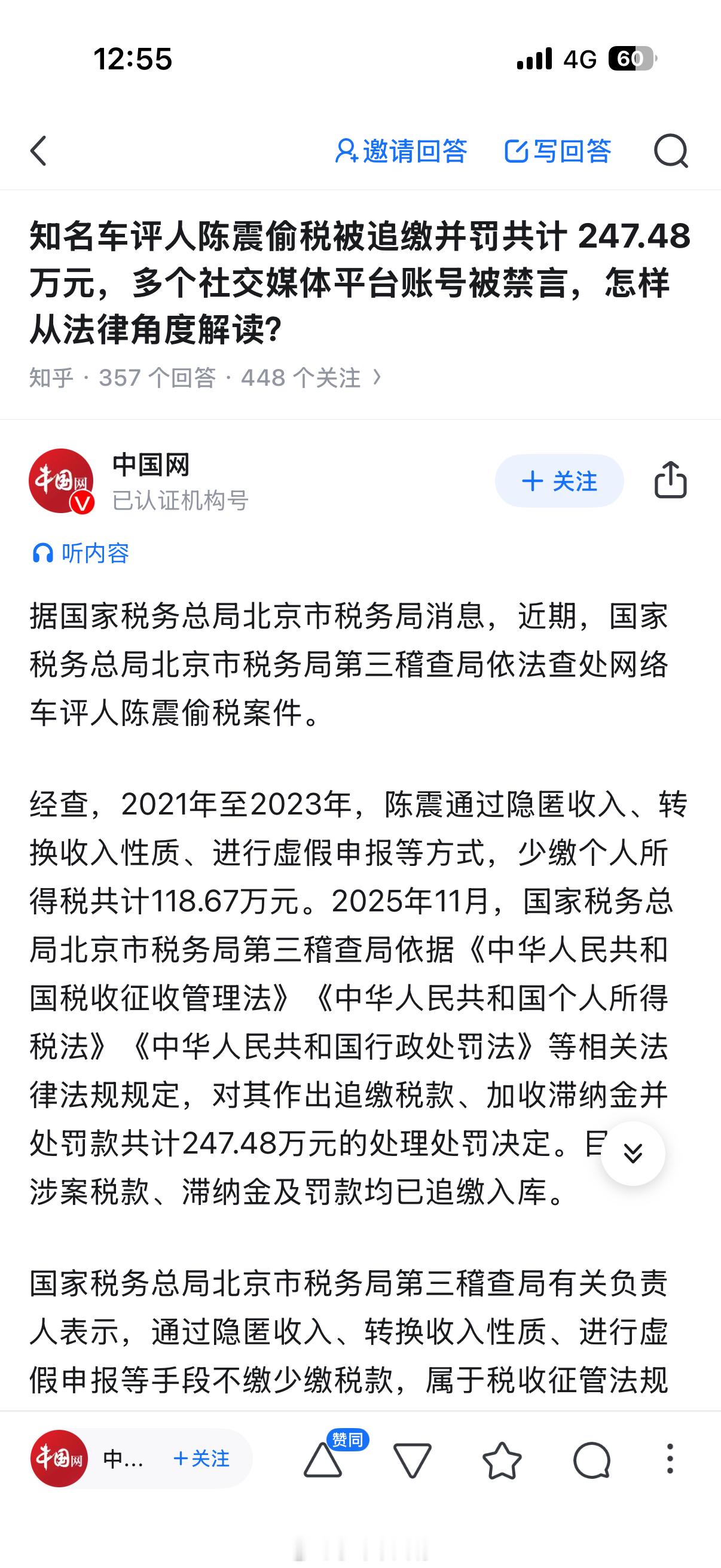 据央视报道:陈震通过隐瞒收入、篡改收入性质、虚假申报等手段,少缴个人所得税118.67万元。税务部门已依法责令其补缴税款、加收滞纳金,并处以罚款,总计247.48万元。