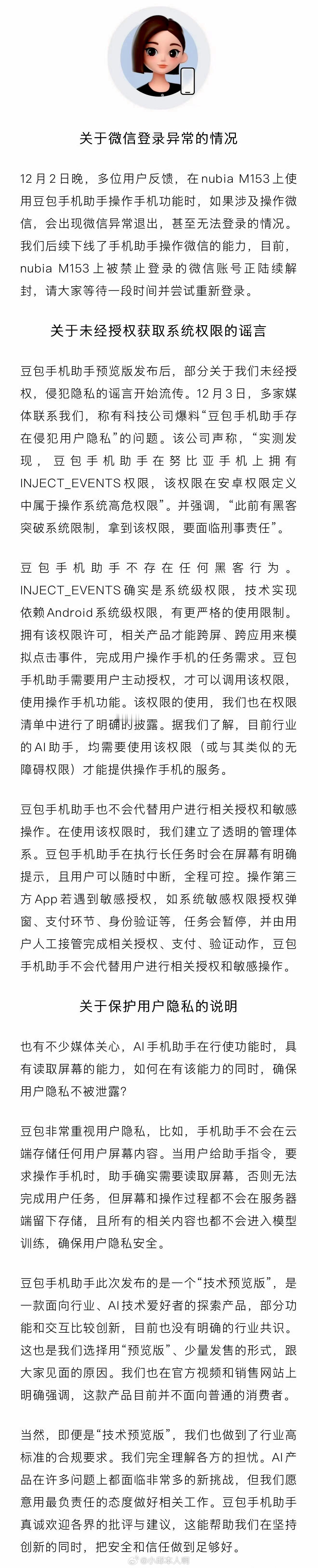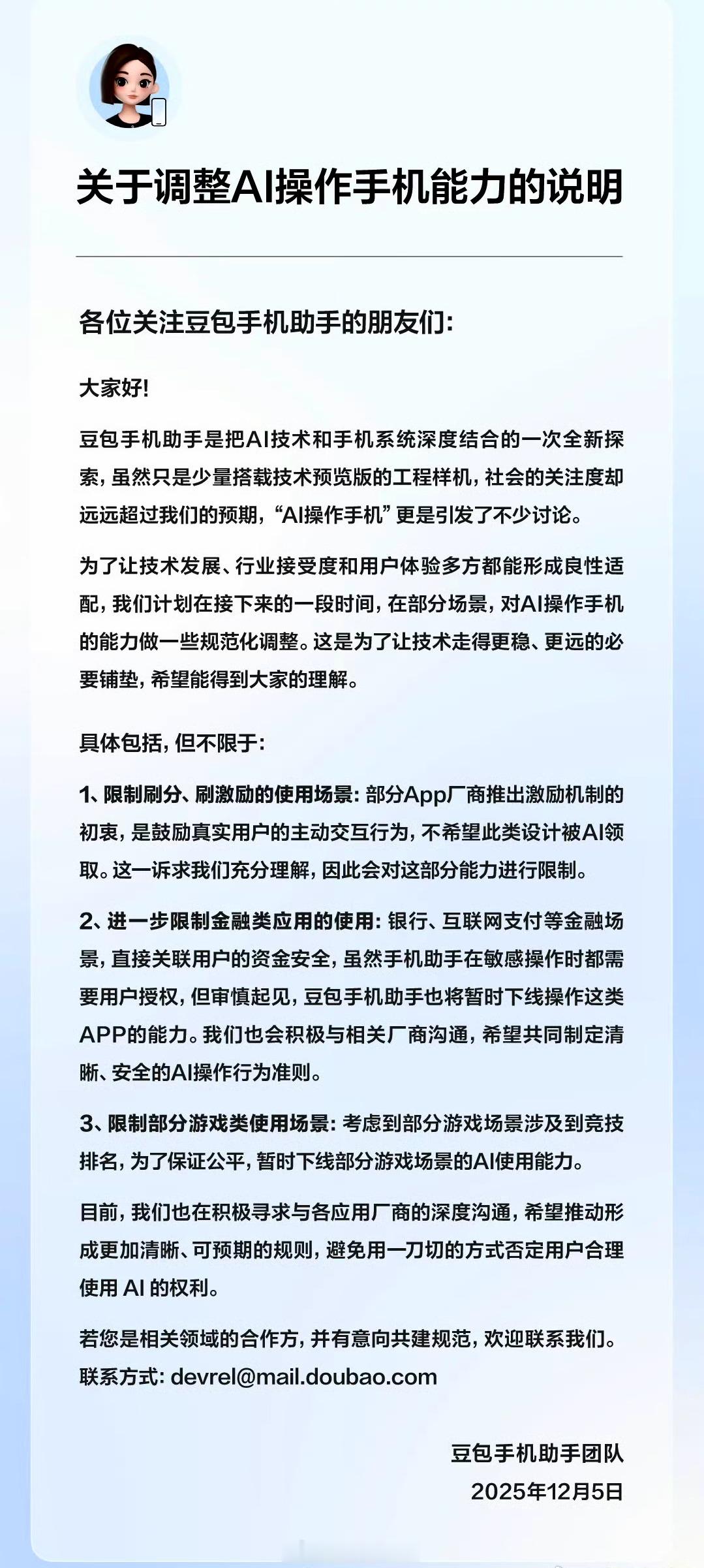 12月5日,“豆包手机助手”官方账号宣布,团队将在接下来的一段时间内,对AI操作手机的功能在部分场景中开展规范化调整。调整范围包括但不限于:限制用于刷分、刷奖励等行为的使用场景,进一步加强对金融类应用的操作管控,并对部分游戏相关场景的AI使用。