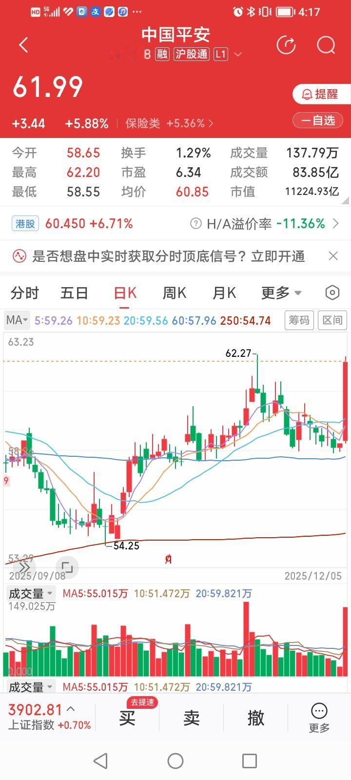 完犊子了!中国平安这次倒车接人有点不到位。害的咱这几天天天挂买单,居然没有成功上车。 自从10月29日在59.17元部分卖出中国平安后,一直找机会在58元以下想把中国平安接回来,结果愣是没找到机会。 中国平安作为中国版的伯克希尔,是牛市的中坚力量,也是牛市的最大受益者。 幸好中国平安一直是咱的重仓股,只要能继续涨,没加上仓的小遗憾也不算什么。