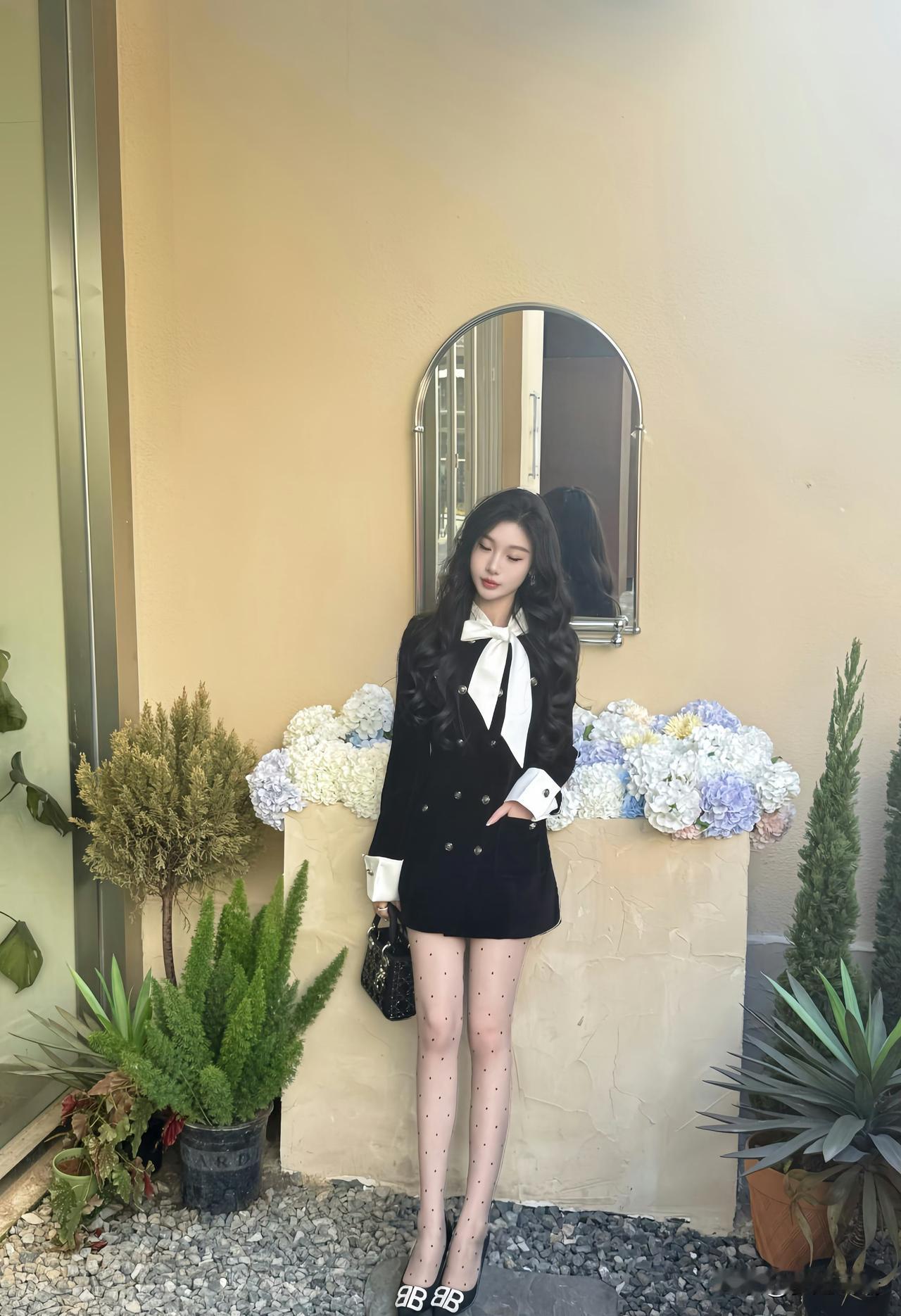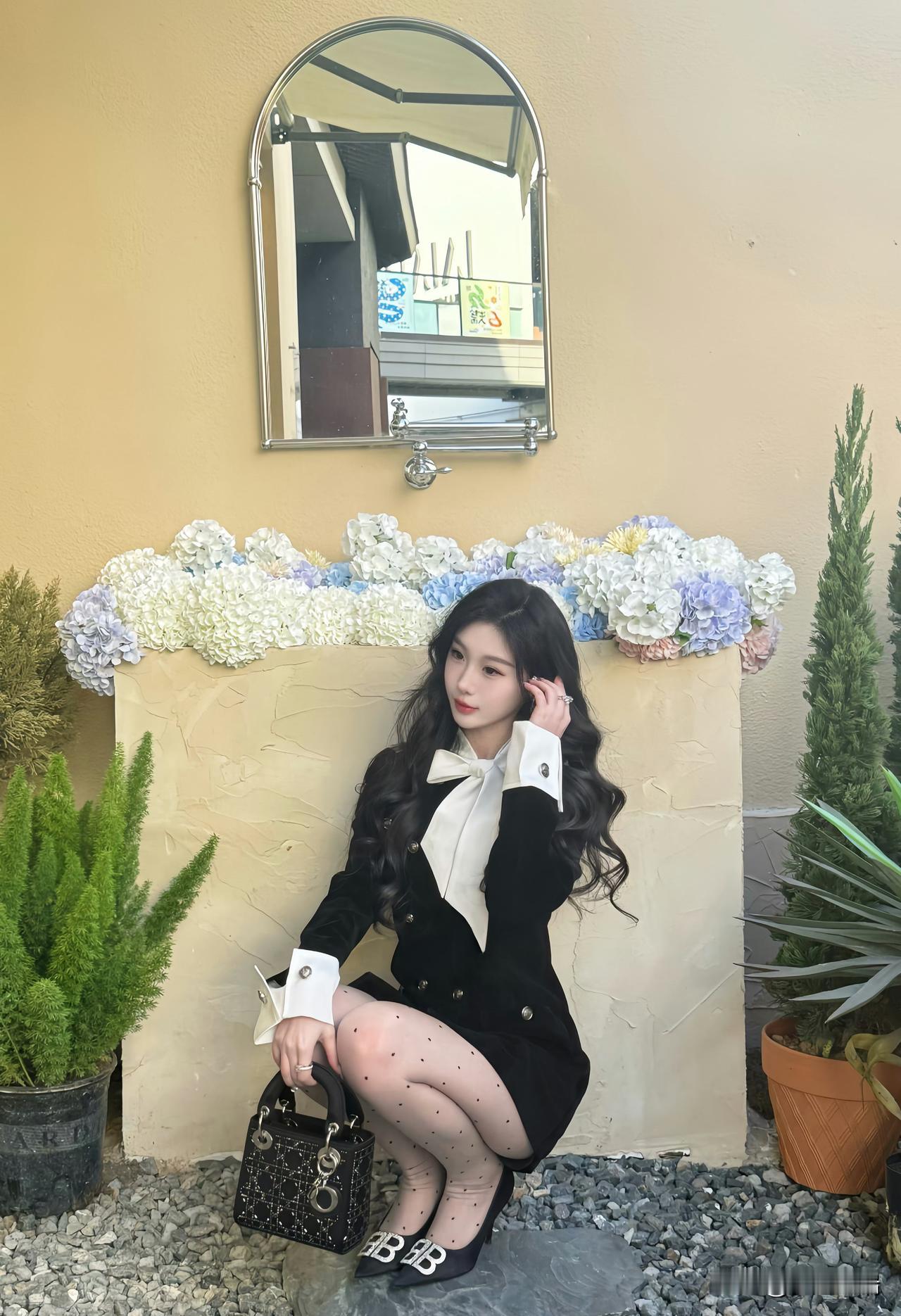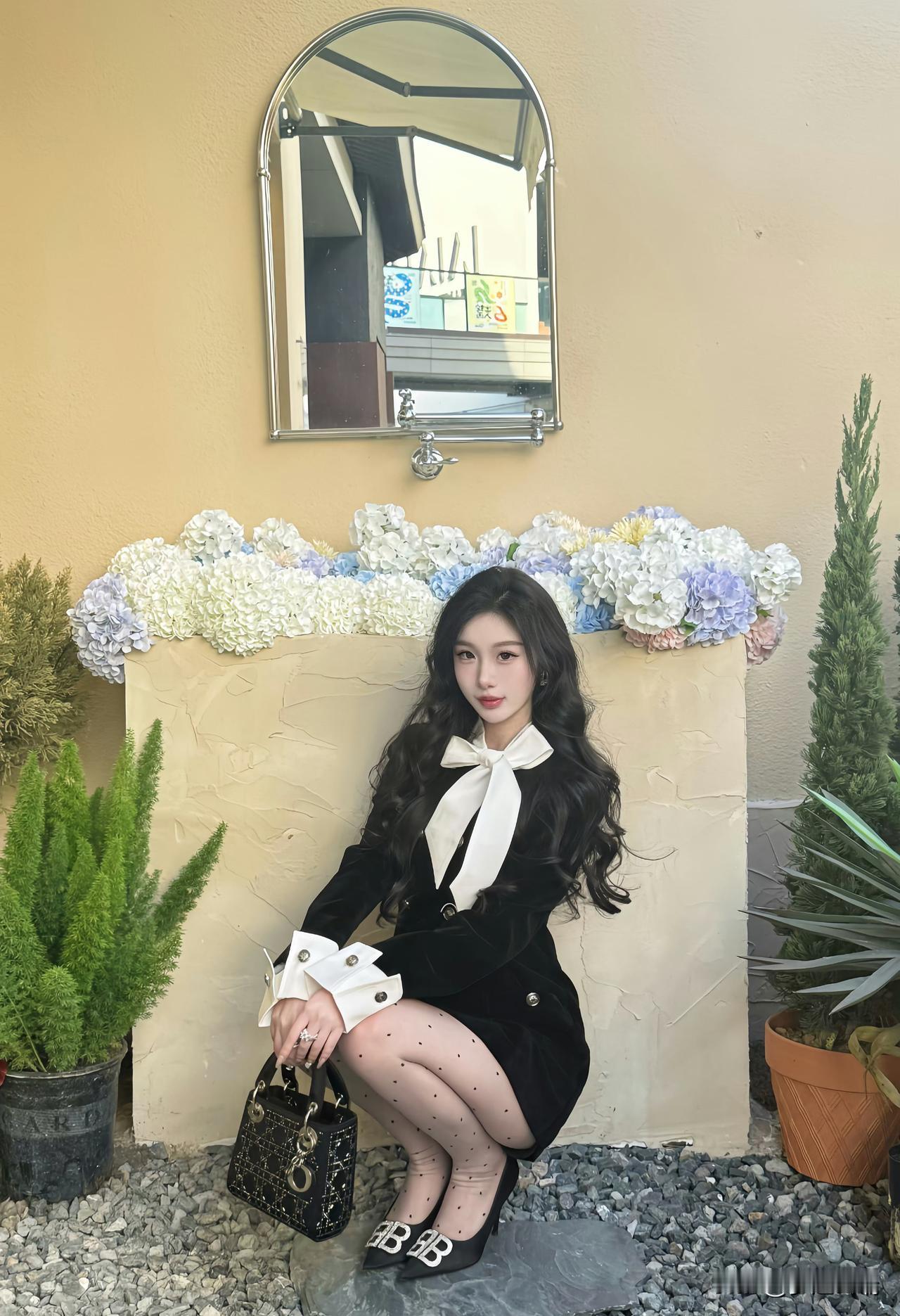 优雅黑裙穿搭,精致花艺背景,时尚感十足!