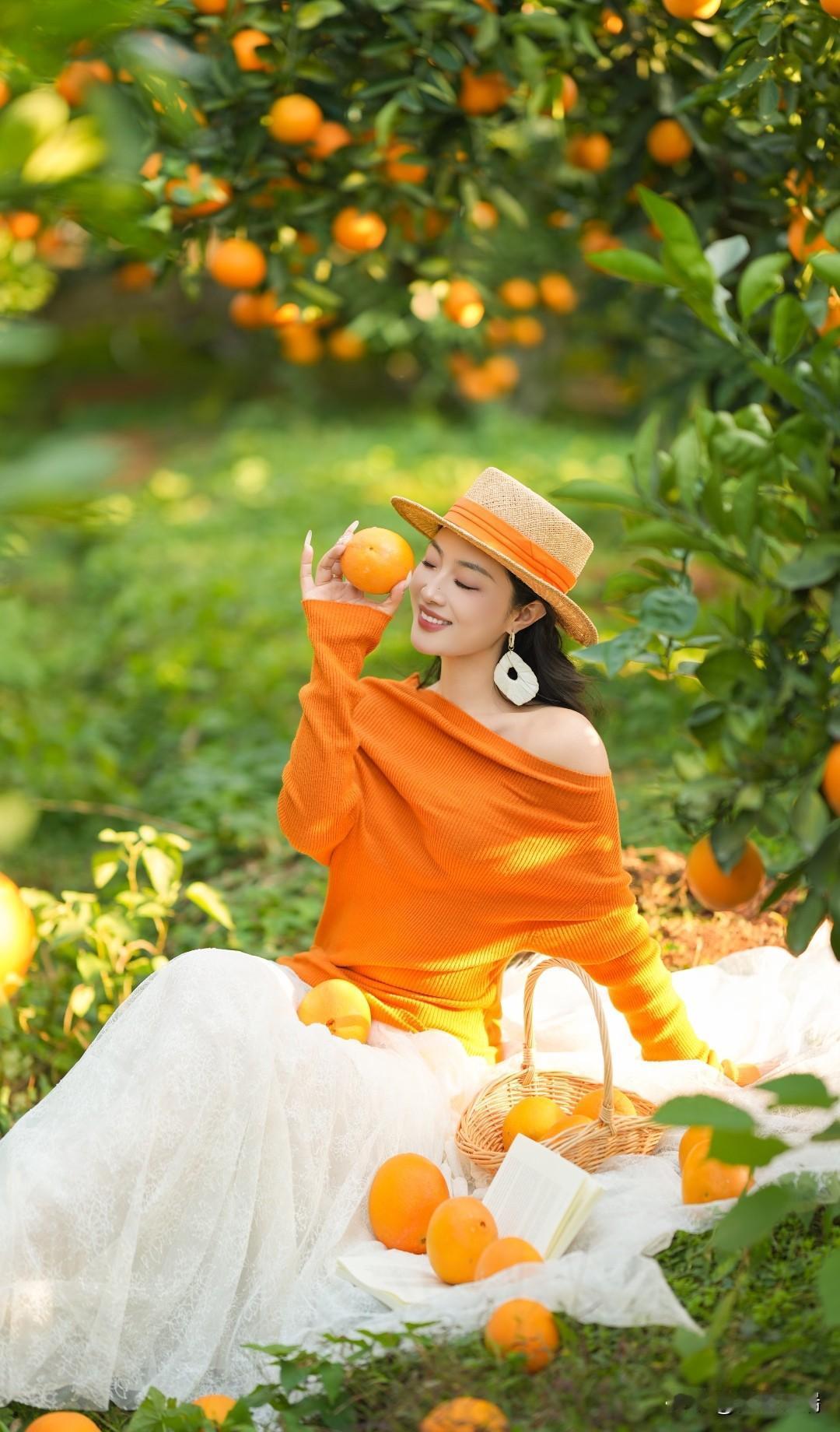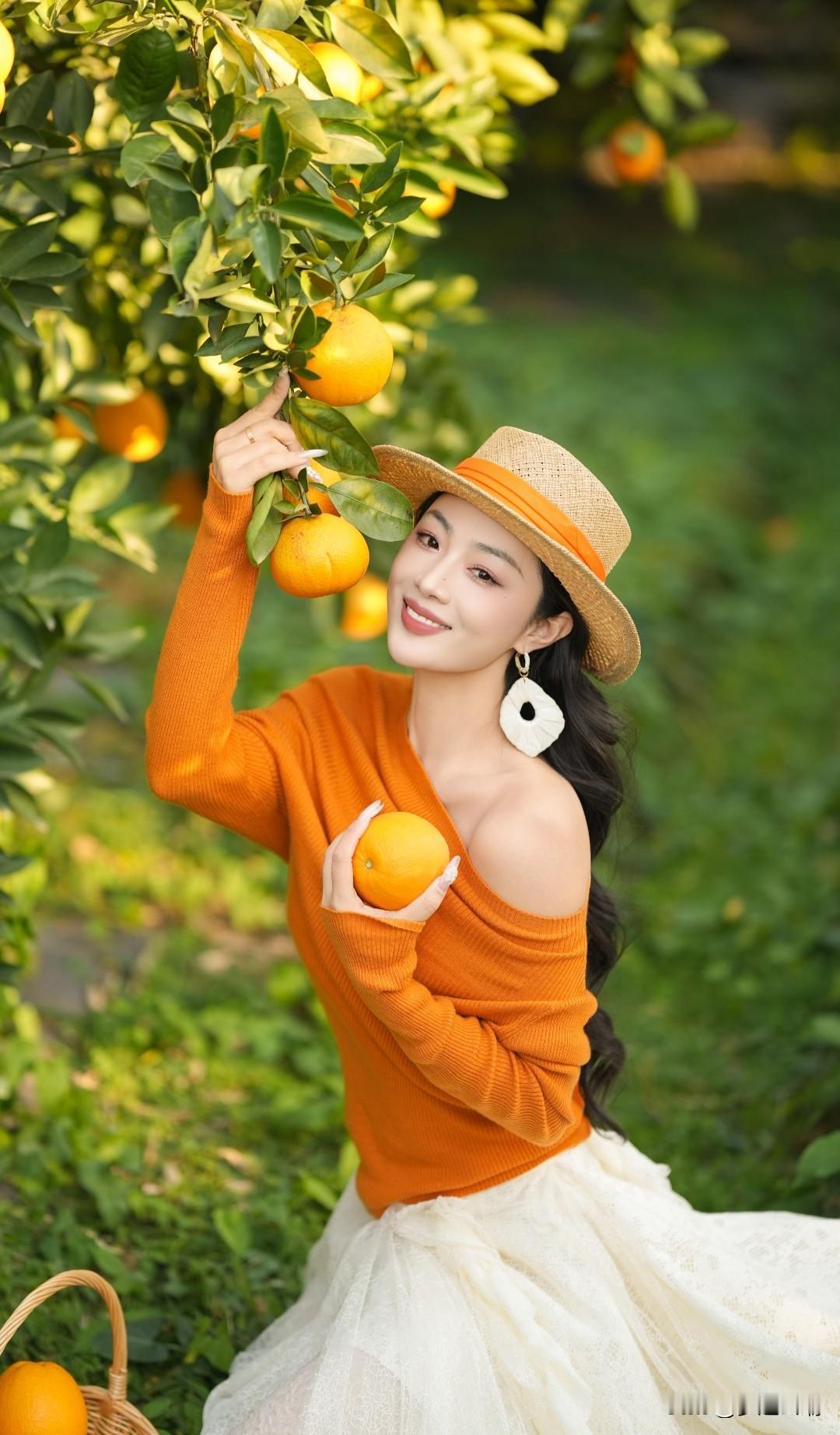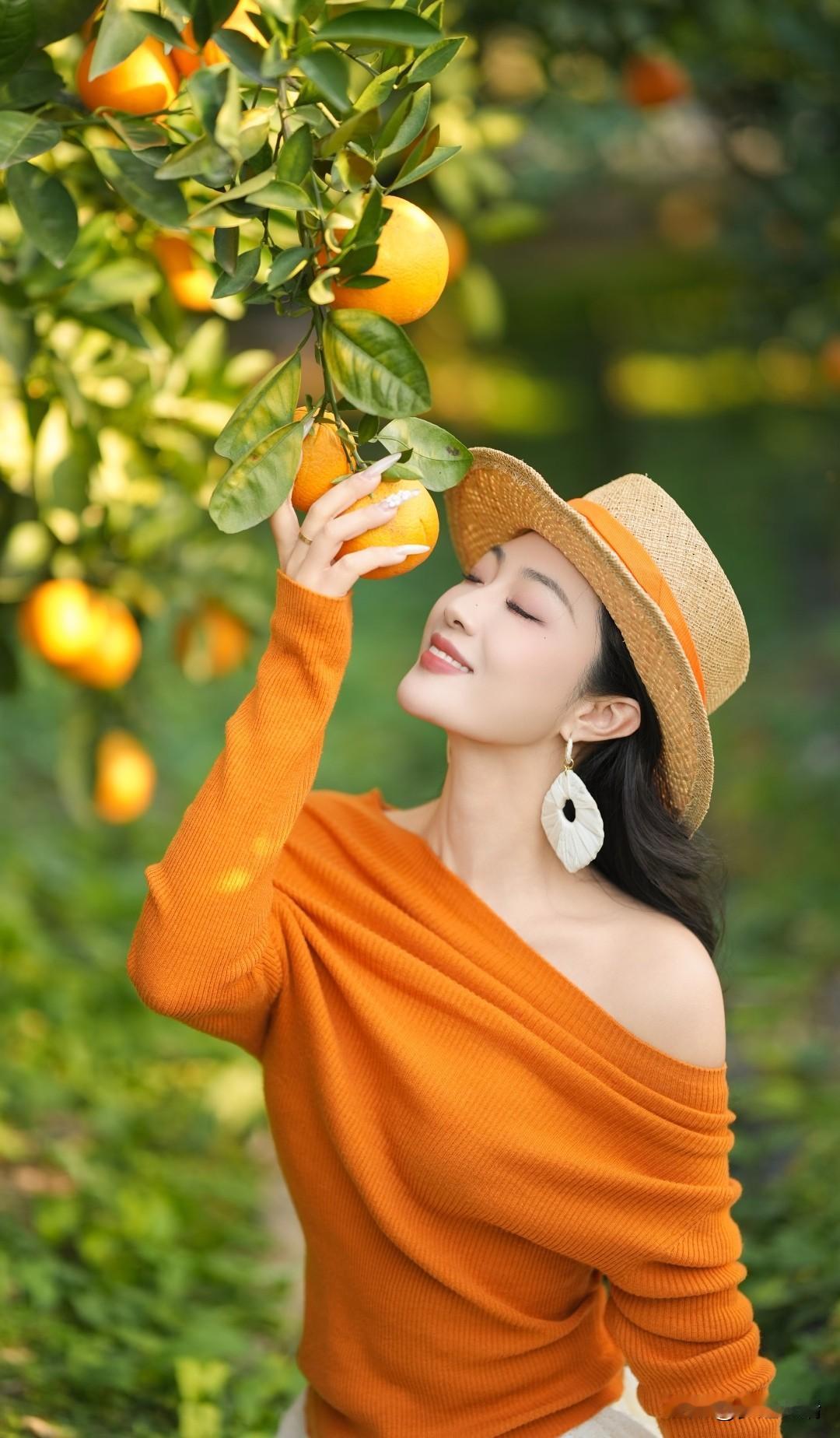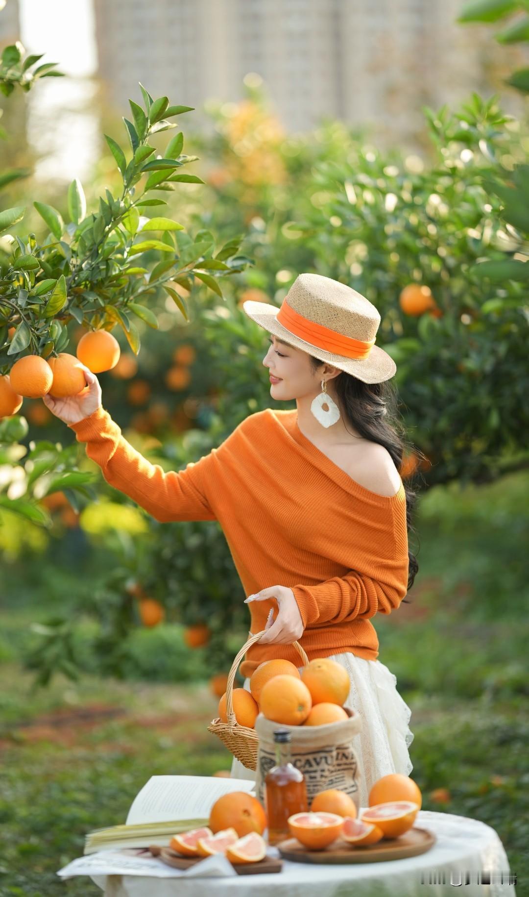 阳光下的橘子园,甜美美女采摘时🍊🌞