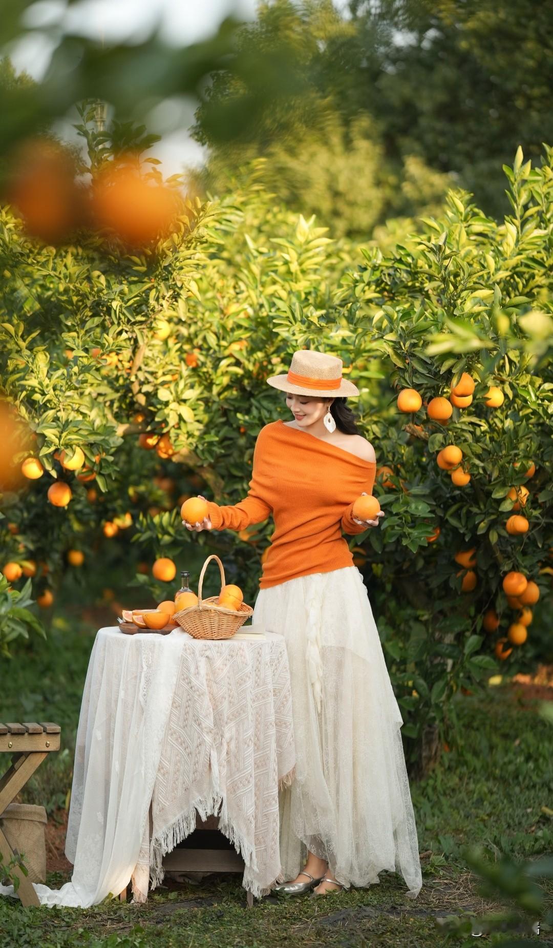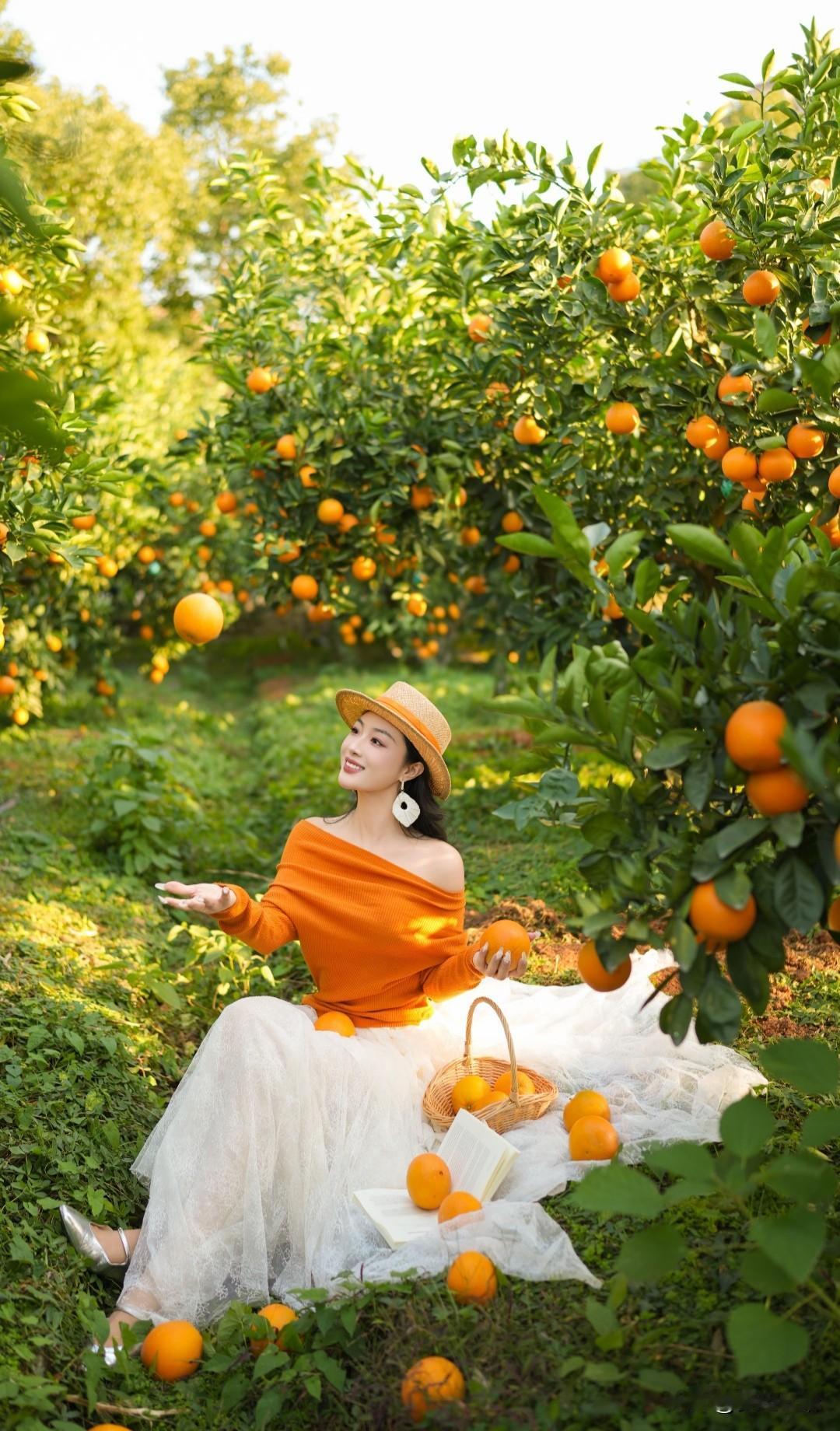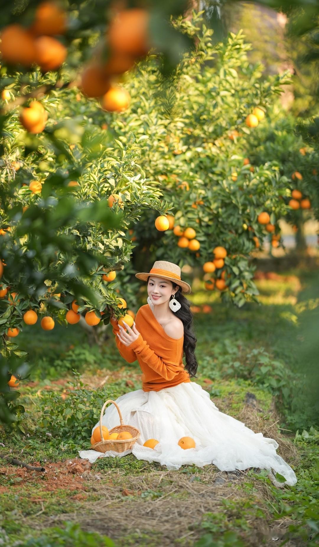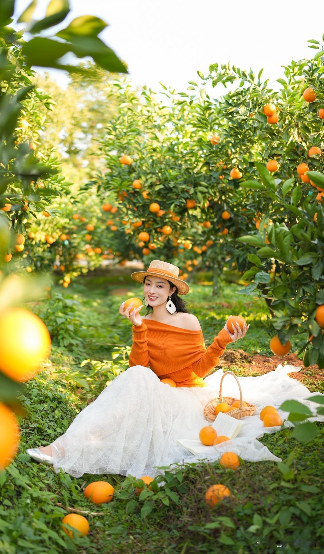 阳光下的橘子园,甜美美女采摘时🍊🌞