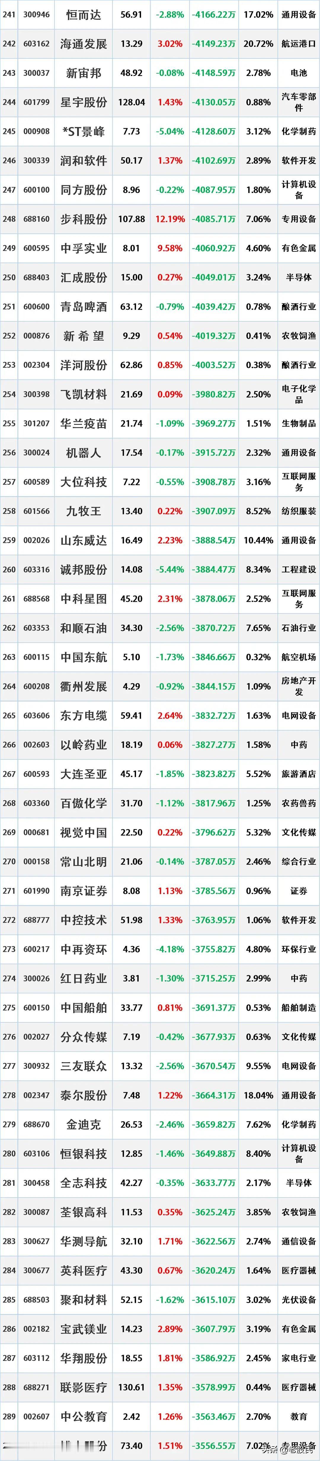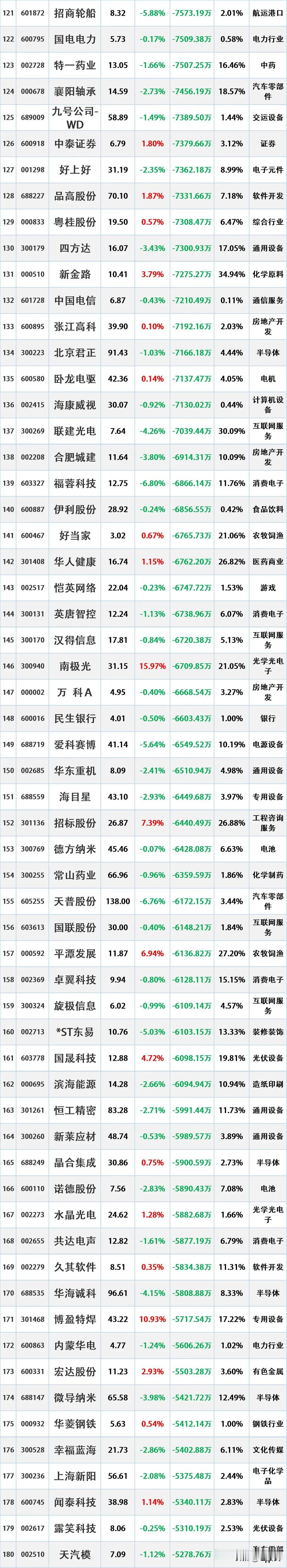 尾盘资金出逃,12月5日主力资金大幅流出的股票名单。 资金流出是指在一定时期内(如一天、一周等),主动卖出某只股票的资金量大于主动买入该股票的资金量。主动卖出是指投资者以买方的报价直接成交,显示出投资者对该股票的消极持有或抛售意愿。