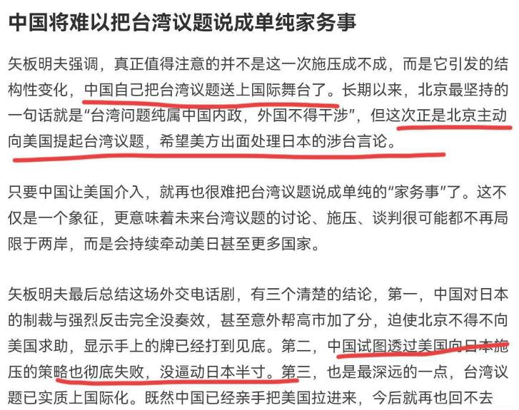 法媒声称,中国“失算了”,中国自己把台湾问题“国际化”了! 12月3日,法新社援引日本人矢板明夫的观点表示,长期以来,北京最坚持的一句话就是“台湾问题纯属中国内政,外国不得干涉”,但这次正是北京“主动”向美国提起台湾议题,希望美方“出面处理”日本的涉台言论。此人声称,只要中国让美国介入,就再也很难把台湾议题说成单纯的“家务事”了。 这个论调听上去好像有理,但仔细一看就知道是在歪曲事实,把中国依法的外交行动,说成“主动国际化”,这其实是故意混淆概念。 事情的起因并不复杂,日本政客最近频频在台湾问题上挑衅,不仅口头炒作“台湾有事就是日本有事”,还把相关表述写进安保文件。 面对这种赤裸裸的干涉,中国当然不能坐视不管。中方召见日本驻华大使、暂停合作项目,并且在联合国阐明立场,这些完全是一个主权国家理所应当的反制措施。 那为什么在处理中日问题时会提到美国?因为日本是美国的盟友,美国在背后纵容甚至推波助澜,中国和美国谈话的目的,并不是“请它出面”,而是让美国约束自己的盟友别在台海挑衅。 找当事国的“家长”说明情况,这叫划红线,不叫请外人过问,可西方媒体偏偏把这件事说反了,好像中国稍作交涉,就成了“掀桌子”的一方。 真正把台湾问题往国际层面推的,不是中国,而是美日两国,美国一方面口口声声坚持“一个中国”,另一方面却加紧对台军售,2025年累计金额已超过200亿美元,还把台湾拉进军事演练。 日本则借机在地区安全文件里“夹带私货”,这种做法才是真正的“国际化操作”。相比之下,中国始终把握着底线,军演针对“台独”,制裁军售企业是反制干涉,一切都在国际法框架内,光明正大。 再说到美国所谓的承诺。中美建交时,美国明明保证不支持“台独”,如今却不断突破红线,中国要求美方履约,本质上是提醒对方遵守当初的约定,而不是邀请介入。 就像双方签了合同,一方违约,另一方去追责,这在任何规则下都说得通,可媒体故意把它描绘成“请对方插手”,这完全是颠倒黑白。 事实上,越来越多的国家并不认同西方的说辞。2025年12月,巴基斯坦、老挝、法国等十多个国家重申坚持一个中国原则,连法国总统的外事顾问也公开表示支持中方。 这说明国际社会早已明白谁在维护秩序,谁在制造纷争,那些反复喊“中国失算”的人,只是在掩盖自己搅局失败的尴尬。 台湾问题的本质,是中国内战遗留问题,与他国无关,中国愿意为和平统一付出努力,但也不会容忍任何“台独”分裂行为,更不会对外部势力的插手坐视。 日本政客拿台湾议题炒作,美国纵容军售,这才是真正的挑衅。中国要亮剑,不是“失算”,而是负责任的大国该有的态度。