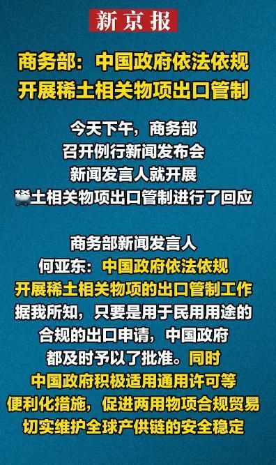 特朗普刚签完“涉台法案”,中国商务部再发通告:中国政府依法依规开展稀土相关物项出口管制! 12月4日,北京的新闻发布会上,中国商务部的回应相当直接,稀土出口该给的批就批,用于民用的申请,只要合规都会顺利放行;但凡涉及非民用,尤其是军工用途,那就别想出中国国门。这句话说得很清楚,也很有分寸,看似平常,实则锋芒毕露。 就在前一天,美国总统特朗普签署了所谓“台湾保证实施法案”,用国内法的形式介入中国内政,挑战一个中国原则,这不是一般的举动,而是赤裸裸地挑衅。 更具讽刺的是,10月底的中美会晤刚刚让双方关系出现缓和的迹象,美国转头就撕毁了刚建立起的一点信任,说白了,这完全是美国自己给自己找不痛快。 因此,商务部选择此时重申稀土管制政策,并不是偶然,而是一次有预谋、有力度的回击。美国人深知稀土的重要性,那是他们高端科技和军工的“命门”,没有稀土,军用雷达、战斗机、导弹统统受影响。中国一句“非民用禁止出口”,等同于直接掐住了他们关键领域的供应线。 事实上,早在10月9日,中国就已启动了部分稀土出口管制。当时还算给了美方一个面子——仅仅控制0.1%的出口量,就是提醒而非威胁。 结果美国人没把话听进去,反倒得寸进尺。现在中国再度亮牌,就是告诉华盛顿,不要以为中国会无条件满足任何需求,更不要妄想一边占着资源,一边背地搞小动作。 从整体上看,这次表态的分量不在字面上,而在它释放出的信号:中国绝不会容忍任何触碰主权底线的行为,美国若继续挑衅,稀土管制力度随时可能扩大,到那时候,受苦的可不是中国,而是那些离不开中国材料的美企。 如今的中国,对外政策已经非常明确——合作可以,但必须在互相尊重的前提下进行。对于那些抱着敌意来的人,中国不会主动挑事,但也绝不会退让,稀土这张牌不是威胁,而是中国维护自身核心利益的武器。规则在那里,谁越线,谁承担后果。 这场以法案和通告为代表的较量,本质上是中美关系的一次深度碰撞,美国想借法律干涉中国,中国则用实际行动证明,国家主权绝不容谈判。最终结局很清楚:谁破坏规则,谁就得付出代价。对于美国这种自认为高高在上的做派,中国早已看透,也不会再容忍。 事实已经说明,今天的中国早已不再是那个任人指手画脚的国家。我们讲原则,也懂反制。面对挑衅,中国的回应既冷静又有力——既有理有据,也绝不手软。稀土管制,就是最直接的信号。 这一次,中国的话,已经说得够明白了。