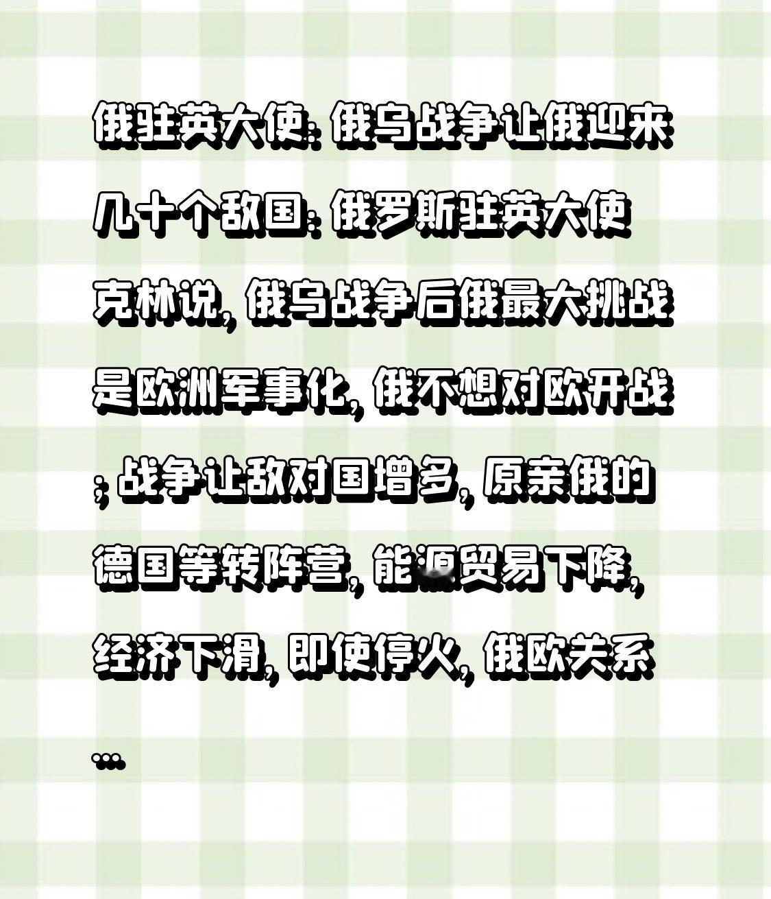 俄驻英大使:俄乌战争让俄迎来几十个敌国:俄罗斯驻英大使克林说,俄乌战争后俄最大挑战是欧洲军事化,俄不想对欧开战;战争让敌对国增多,原亲俄的德国等转阵营,能源贸易下降,经济下滑,即使停火,俄欧关系恢复需漫长时间,经济仍会萎靡。