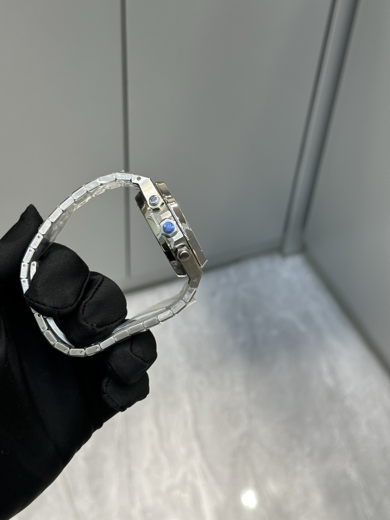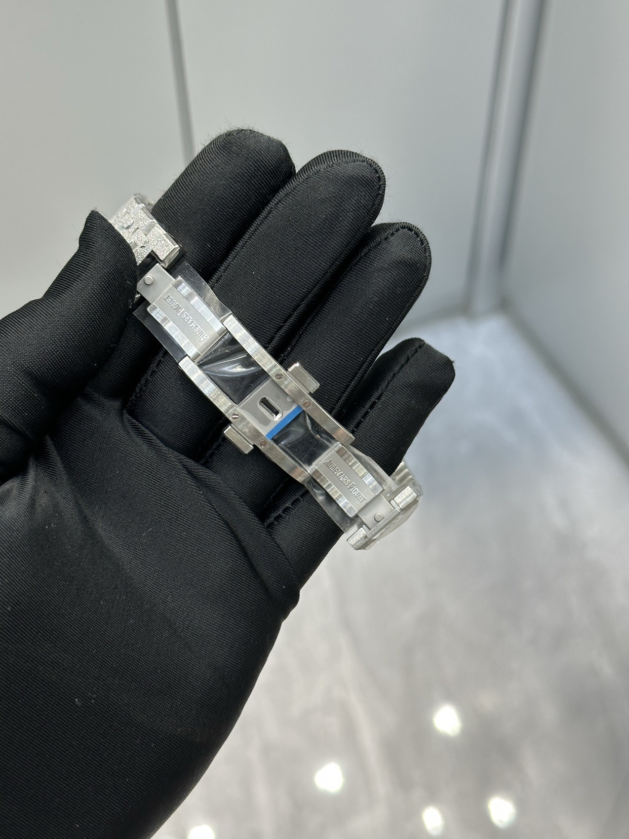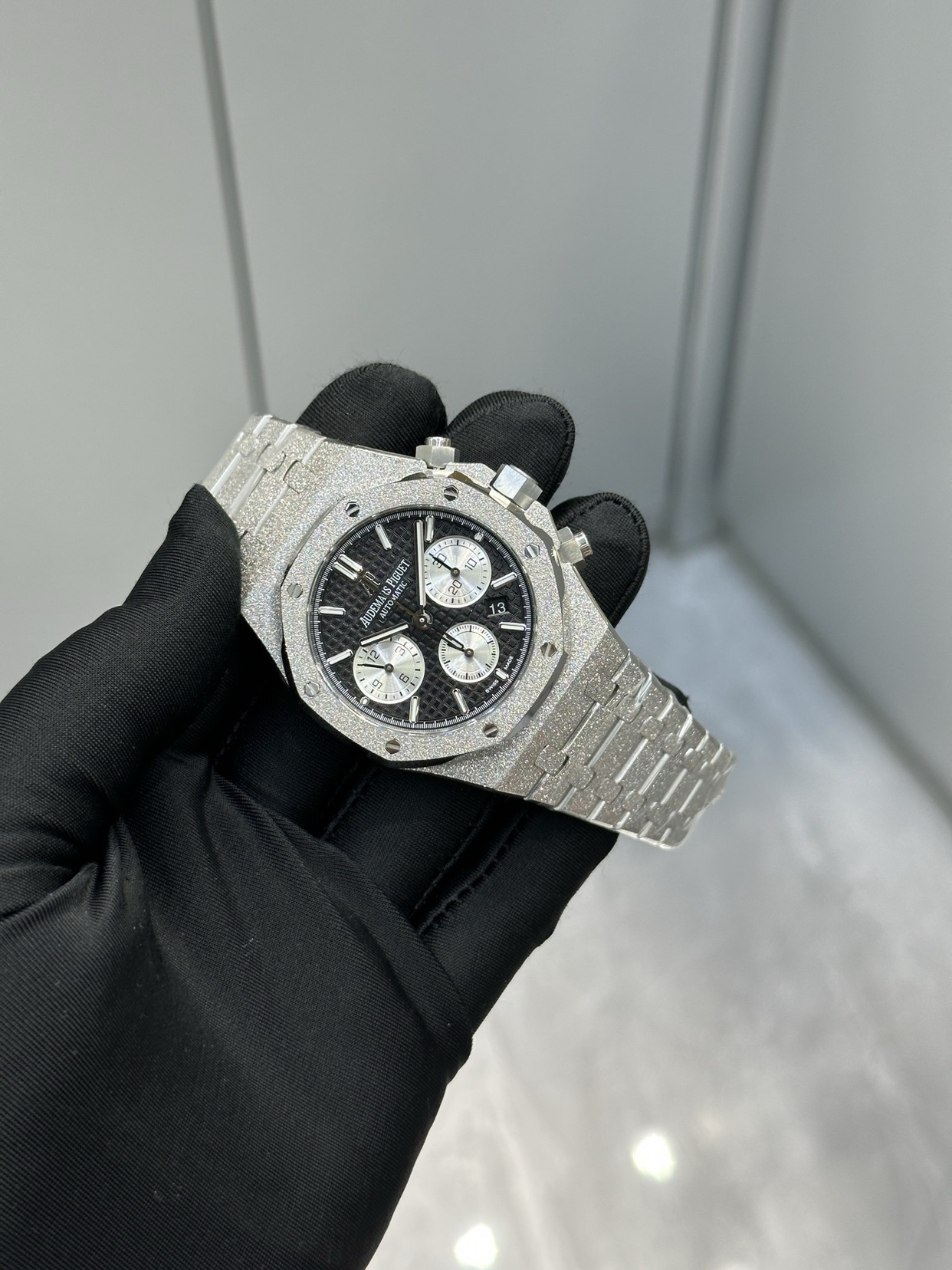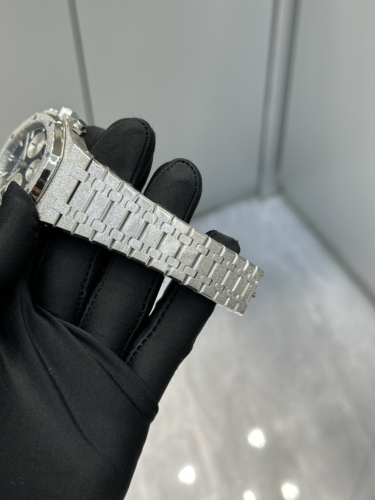 “霜金”是爱彼独家的表面处理工艺。工匠用一种顶端镶有钻石的古老工具,在18K金的表壳和表带上,一下一下地锤击出极其细微的凹痕。这些不规则的微小切面,让光线散射开来,形成一种朦胧的、如钻石粉尘般晶莹的视觉效果。它不像抛光镜面那样张扬锐利,而是内敛的、丝绒般的璀璨。尤其在走动时,手腕轻微的晃动就让那层“霜”活了过来,流光溢彩。