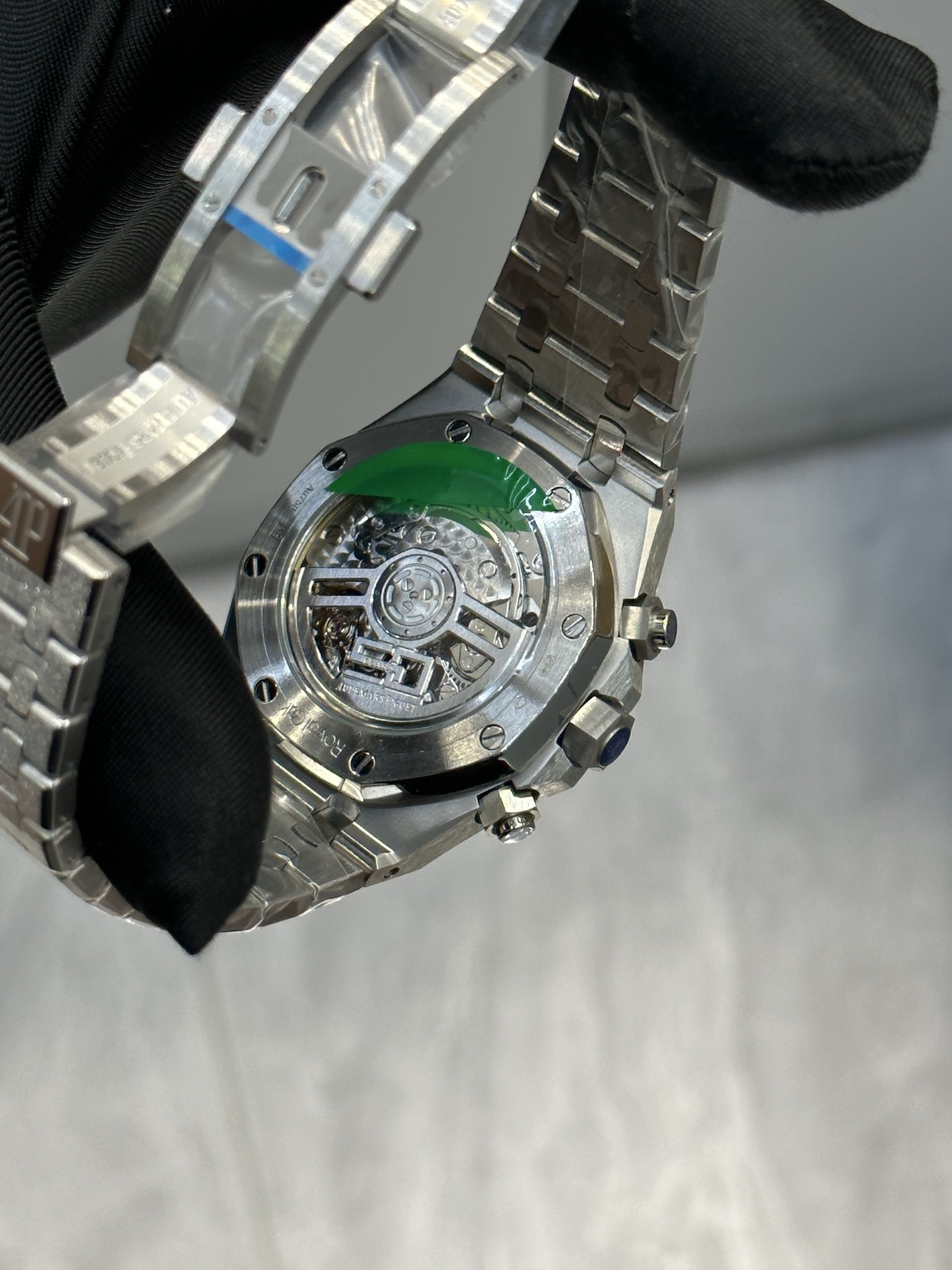 按下计时按钮,指针精准开始舞动。内部搭载的是爱彼自产的高级计时机芯,透过蓝宝石水晶表底,精美的打磨和镂空的22K金自动摆陀尽收眼底。它提醒你,这不仅仅是一件珠宝,更是一台精密的仪器。
