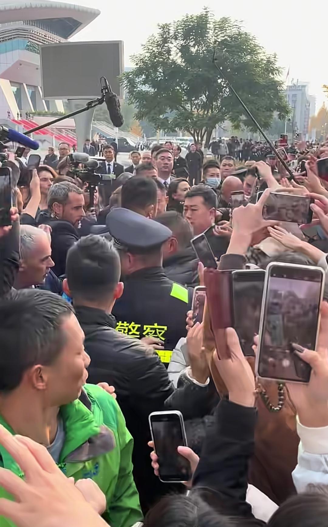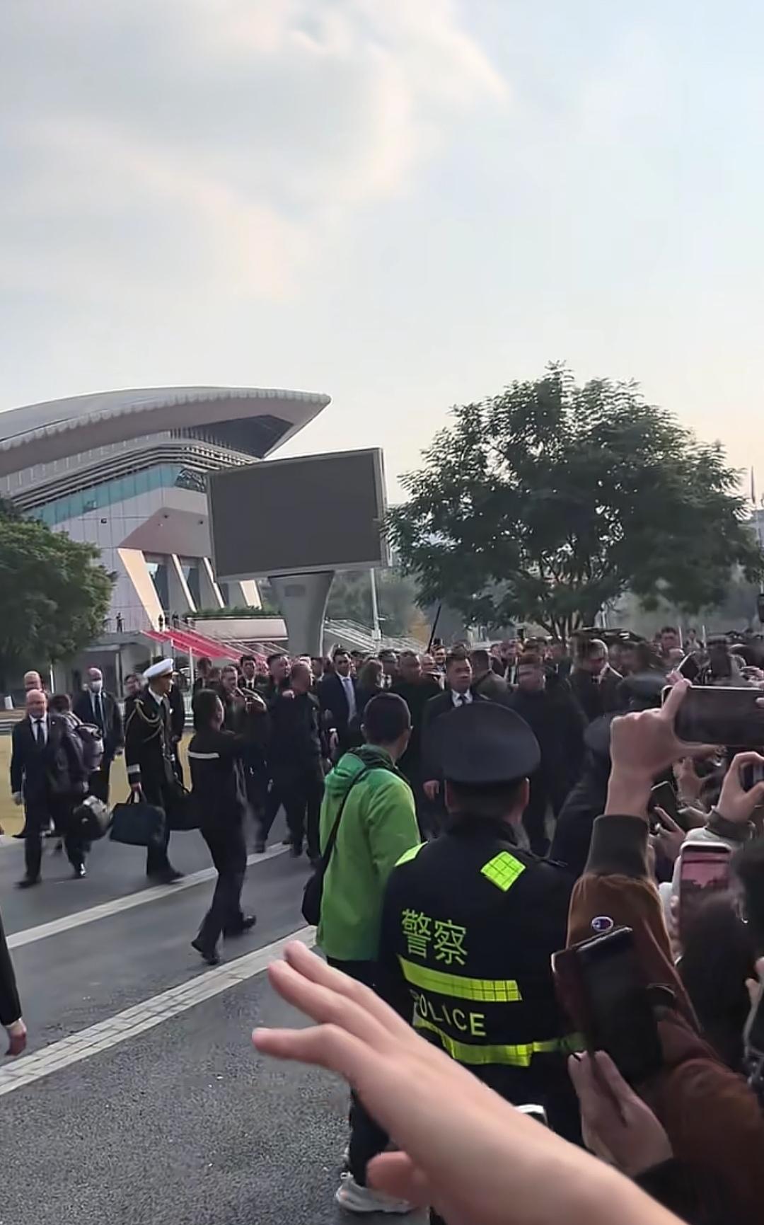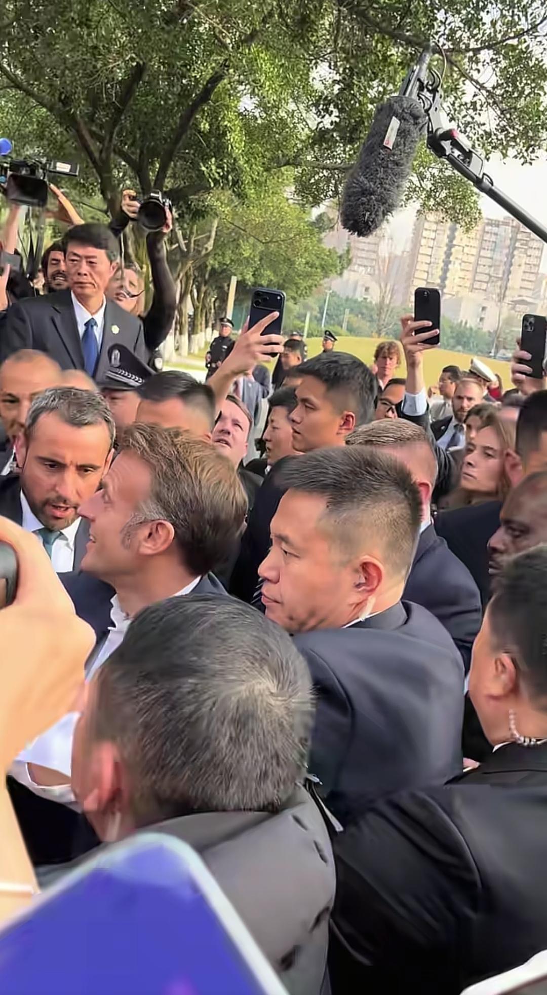 12月5日,马克龙来到大学校园内,校内学生热情欢呼,让安保人员一顿紧张,无论是他自带的安保人员还是我们的安保人员,都感受到护送压力,马克龙被围住了。 学生们都太热情了,一直拍照,表示欢迎。 有一个女保镖穿着工作制服,很漂亮,忙着上前劝导学生不要太拥挤了。