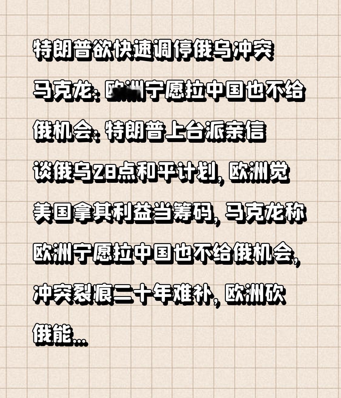 特朗普欲快速调停俄乌冲突 马克龙:欧洲宁愿拉中国也不给俄机会:特朗普上台派亲信谈俄乌28点和平计划,欧洲觉美国拿其利益当筹码,马克龙称欧洲宁愿拉中国也不给俄机会,冲突裂痕二十年难补,欧洲砍俄能源、援乌,双边信任尽失,靠中国合作稳场。