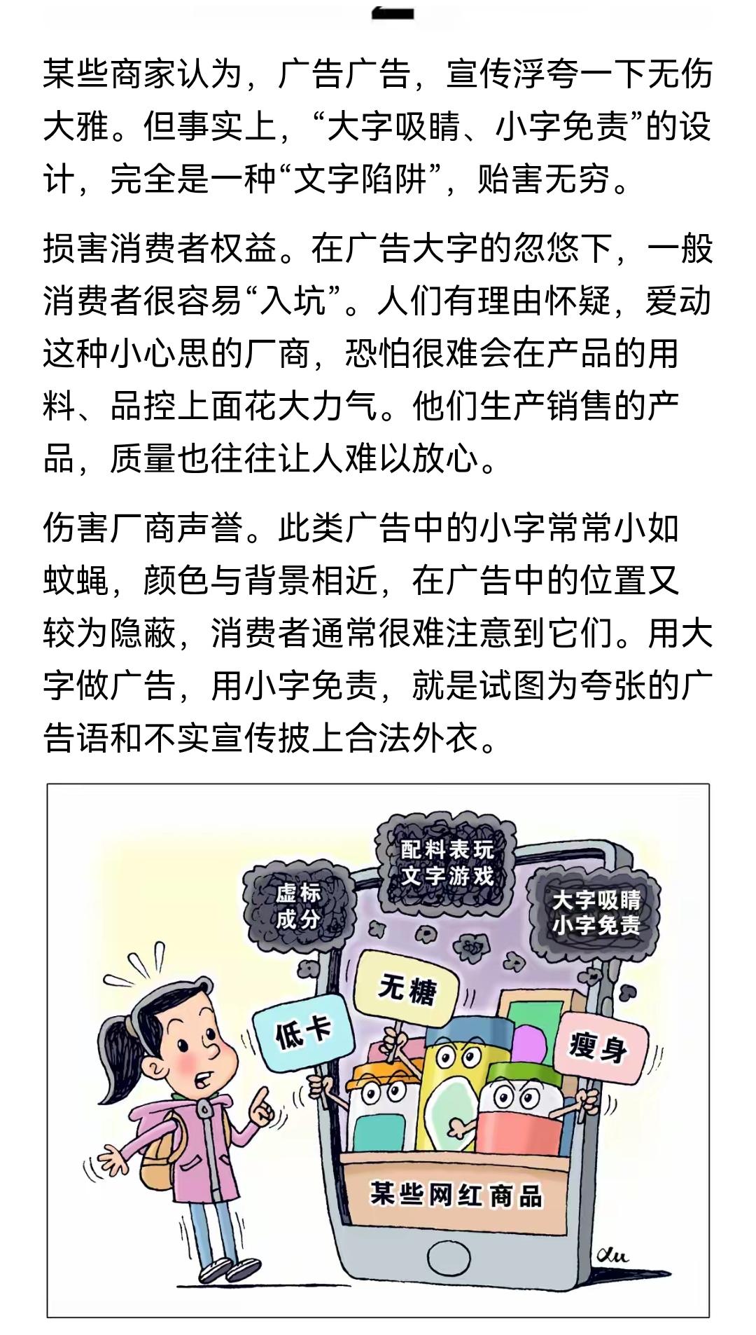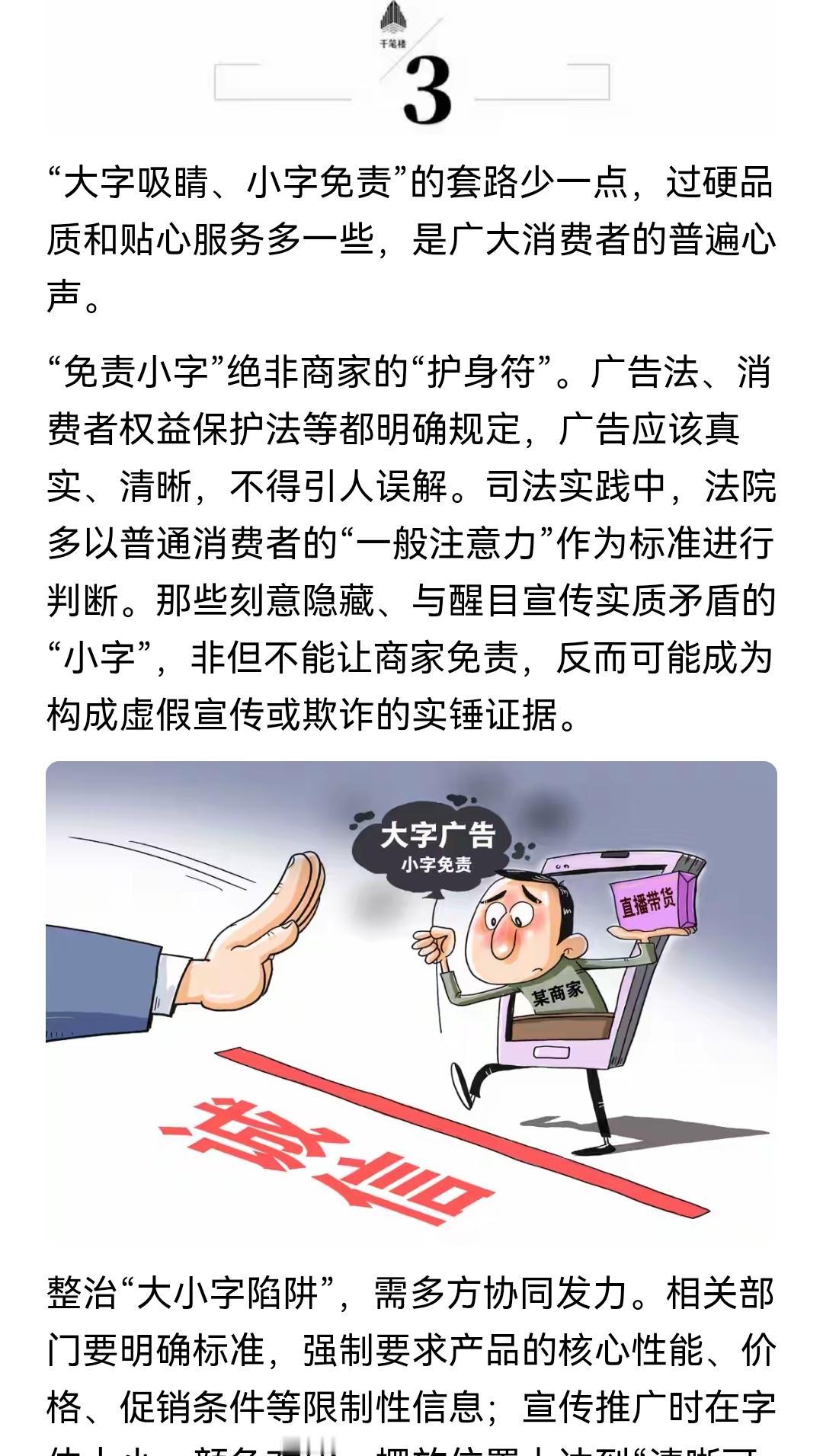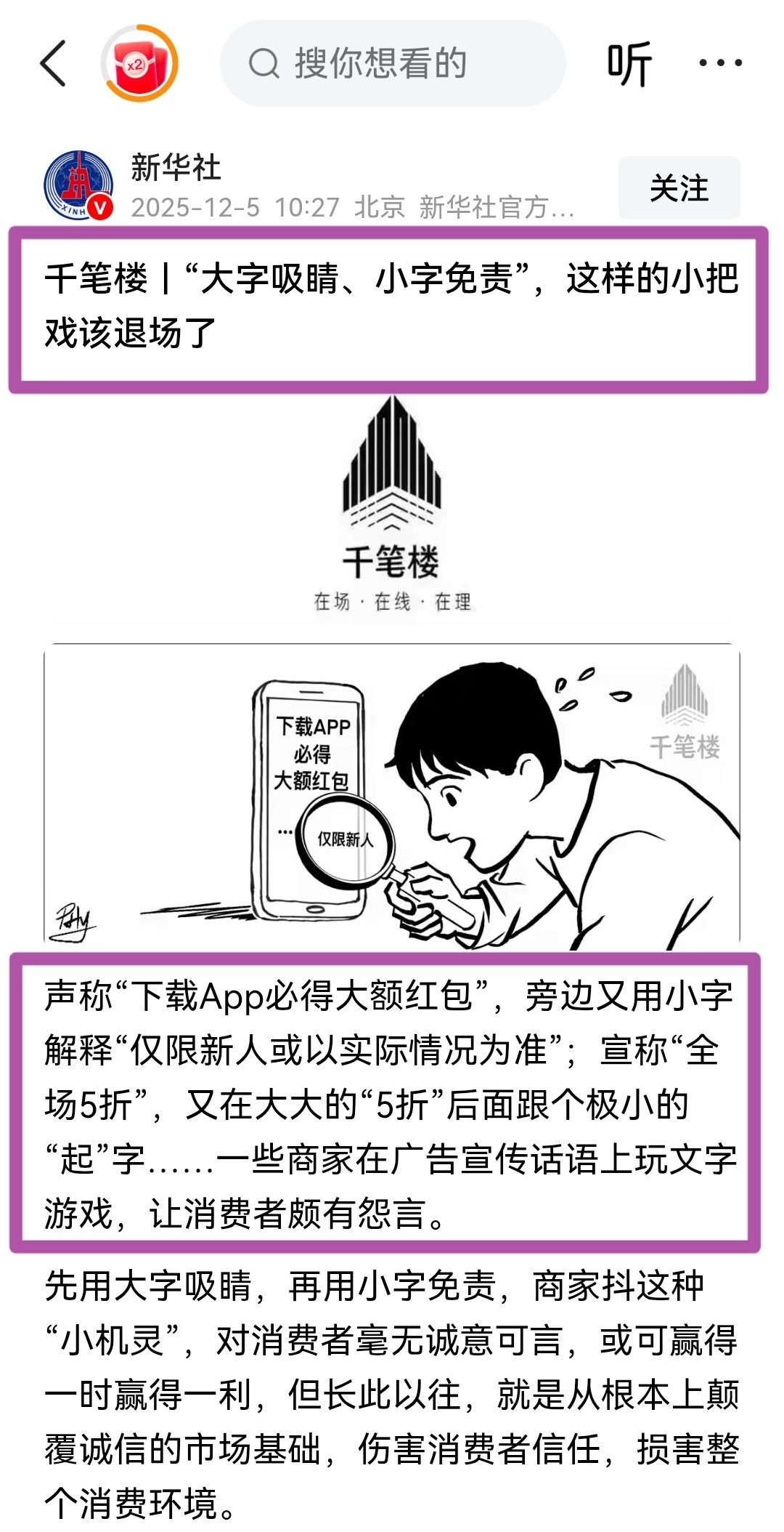 新华社发布的文章把大字吸睛、小字免责的本质、危害和破解路径都扒得明明白白,既接地气又有深度。 文章里提到的“三吹”现象特别典型:把“设计目标”吹成“产品事实”、用过期或未卜先知的调研数据撑销量噱头、靠“5折起”“新人专享”稀释优惠力度,这些操作的核心逻辑都是“先勾住人,再甩锅免责”。 商家觉得只要加了小字就有了“护身符”,但其实这是对《广告法》的误读,法律明确要求广告信息“清晰可辨”,那些藏在角落、小如蚊蝇的免责声明,在普通消费者的“一般注意力”标准下,根本不具备法律效力,反而会成为虚假宣传的实锤。 消费者一旦踩过一次坑,就会对整个品类甚至整个市场产生信任危机,从“敢消费”变成“怕消费”,这对提振消费的大环境来说,无疑是致命的内耗。 更值得警惕的是,这种“文字陷阱”还会消解商业社会的契约精神。商家用大字画饼、小字拆台,本质上是对消费者的不尊重,也是对商业规则的践踏。短期看能赚点快钱,但品牌口碑是长期积累的,一旦舆论发酵,多年攒下的信任可能一夜崩塌,之前不少品牌因为类似的宣传翻车,就是最好的教训。 文章也给出了解决思路,多方协同才是关键。监管部门要把“清晰可辨”的标准量化,比如明确字体大小、颜色对比度、摆放位置的硬性要求,对汽车、金融这些重灾区搞专项整治,让违法成本远高于投机收益。平台要扛起审核责任,不能给这类套路广告留传播渠道。消费者也要多留个心眼,但更重要的是,要让大家维权时不陷入“商家拿小字当挡箭牌”的困境。 说到底,商业的核心从来不是话术多花哨,而是产品和服务够不够硬。那些总想着靠“小机灵”走捷径的商家,终究走不远;只有把诚信刻进骨子里,把心思花在提升品质上,才能真正站稳脚跟。 新华社好文