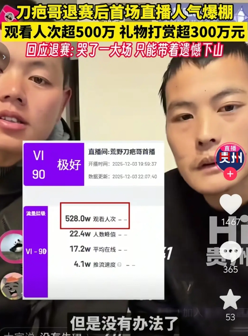 10月8号参加第二届七星杯“荒野求生”赛,12月2号因身体原因退出决赛,3号开首场直播,大获全胜,刀疤哥收礼物收的都心惊肉跳。不到两个月的时间,刀疤哥逆天改命。如果不是参加节目“荒野求生”,如果不是主办方大肆宣传,或许刀疤哥永远就没人知道他,更不会成为网红。所以说人这一辈子选择大于努力,七分天注定,三分靠打拼。