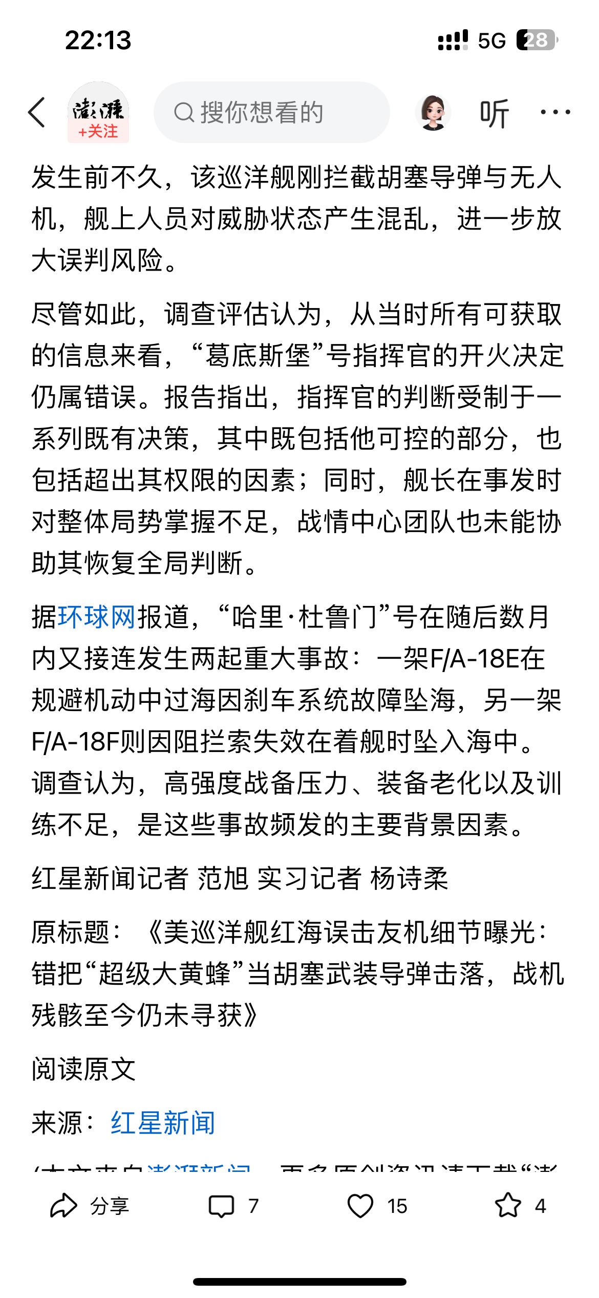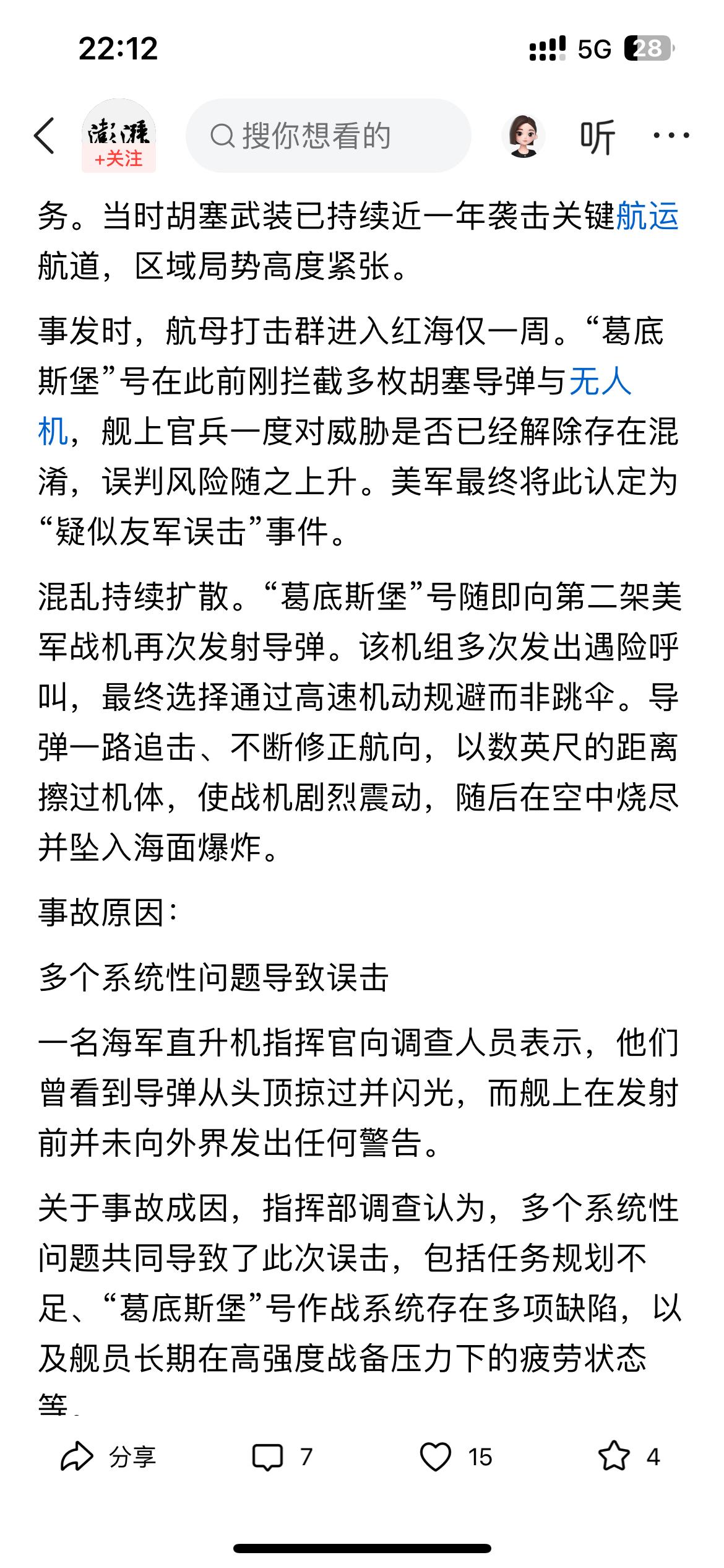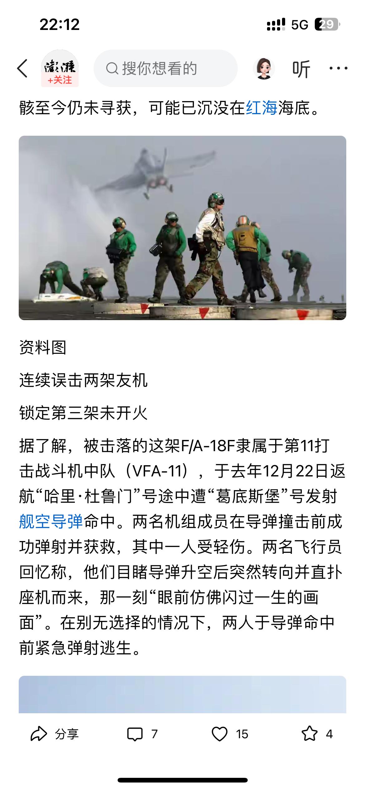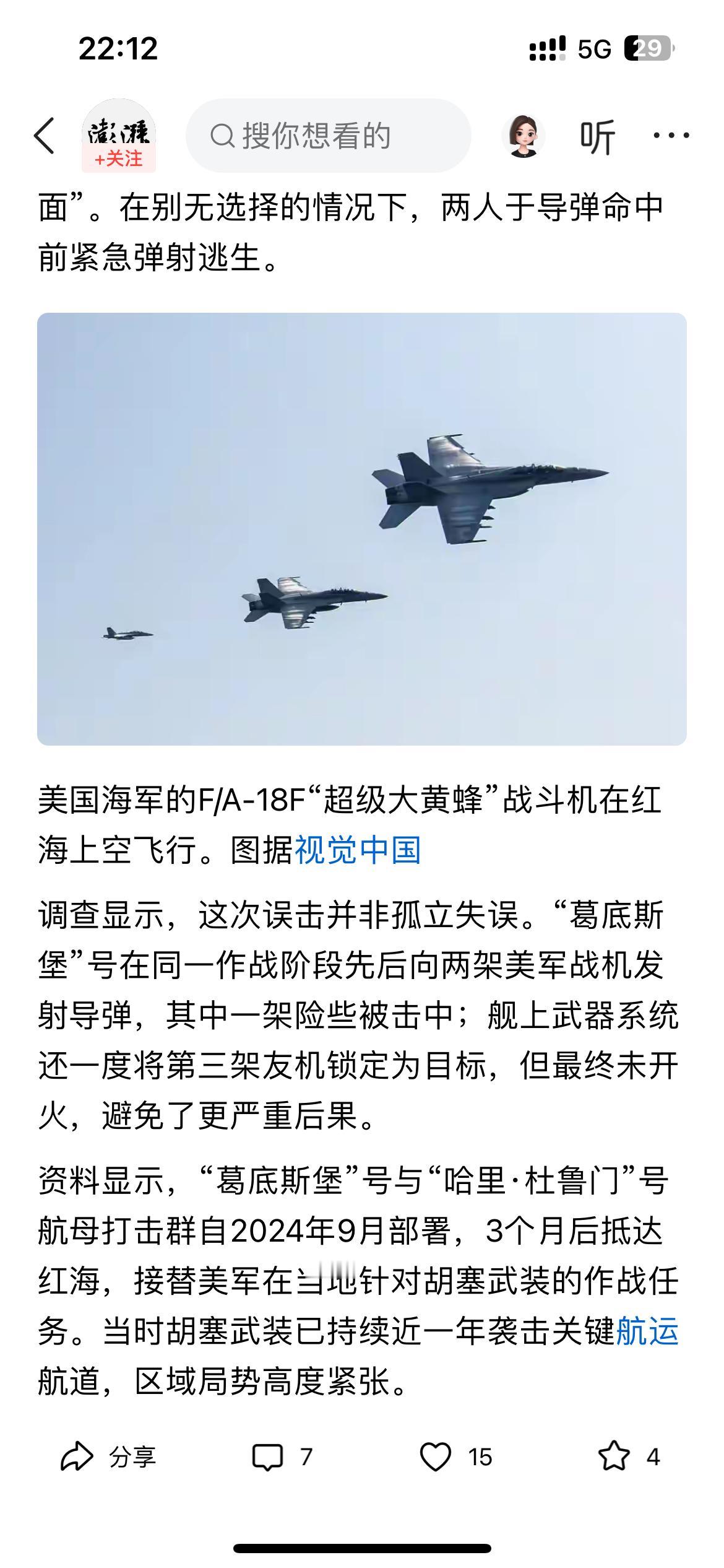 以为是美国海军12月4日有两架F/A-18F舰载机在红海海域遭自家巡洋舰友军误击坠海了。 结果是美国海军12月4日公布2024年12月底在红海海域,“哈里杜鲁门”号航母的护航巡洋舰“葛底斯堡”号官兵将两架F/A-18F舰载机误判为“来袭导弹”,并击落其中一架的调查报告。 正想说这美国这次损失大了,这舰载机是坠海坠不停了,前一段日子刚有两架舰载机在南海海域坠海,结果这是去年两架舰载机遭误击的调查报告!虽然说坠海的舰载机未打捞到,但是两名飞行员弹射逃生并获救,对于美国“人命大于装备”,舰载机没有打捞上来,飞行员只要活着,就是“胜利”。