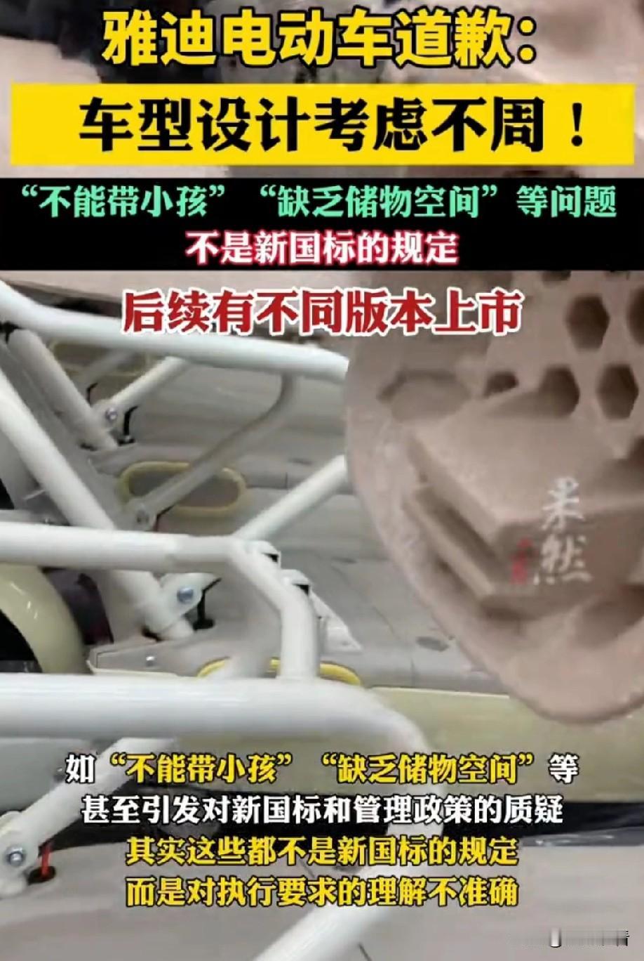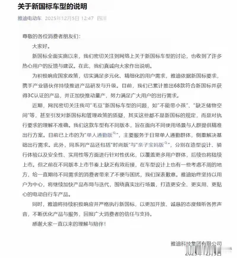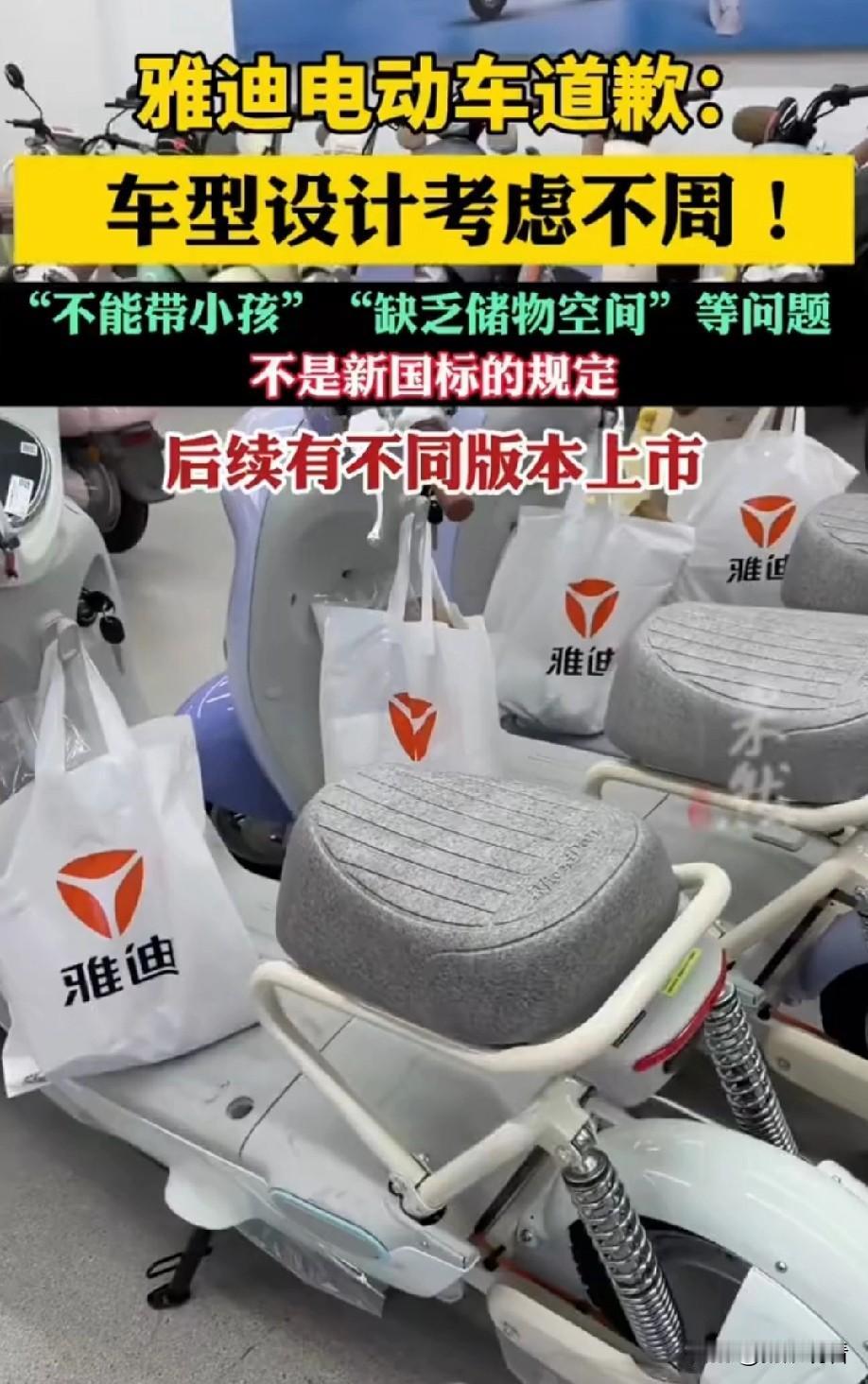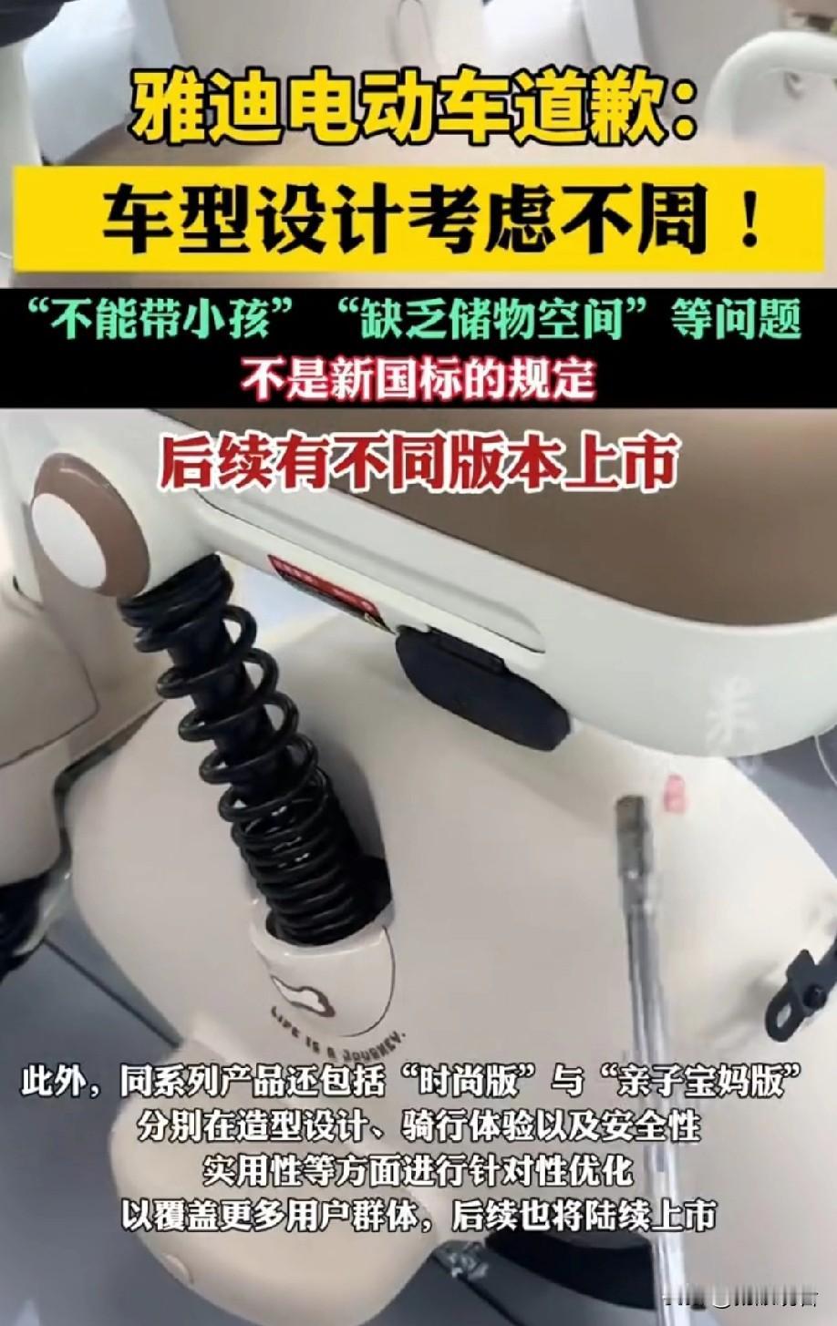 雅迪致歉❗新国标车型争议终于有说法了 新国标12.1实施后,雅迪毛豆车型直接被骂上热搜😭 今天官方终于发声明道歉了,整理好重点给大家划清楚! 🔍 争议起因 新国标落地后,不少买了雅迪“毛豆”的宝子吐槽: ❌ 不能带小孩,后座设计不合理 ❌ 几乎没有储物空间,日常通勤超不方便 甚至有人误以为是新国标不让做后座、储物设计,引发一堆误解 📢 雅迪官方致歉&关键说明 1. 先澄清!不是新国标的问题!新国标根本没禁止后座和储物装置,市面上70%以上合规车型都有后衣架,别骂错重点啦 2. 问题出在雅迪自己:上市的“毛豆”是「单人通勤版」,主打基础出行,但「时尚版」「亲子宝妈版」没同步上,版本衔接翻车,没考虑到大家的多元需求 3. 整改方案来了! ✅ 加快毛豆系列剩余版本量产,亲子版会优化儿童安全配置+加大储物空间 ✅ 目前已推出68款3C认证新国标车型,高中低价位、不同场景(通勤/亲子/载货)都覆盖 总结一下:这次是雅迪车型规划失误,不是新国标“太严格”~ 想买新国标电动车的宝子,不用慌,多对比几款合规车型就好!