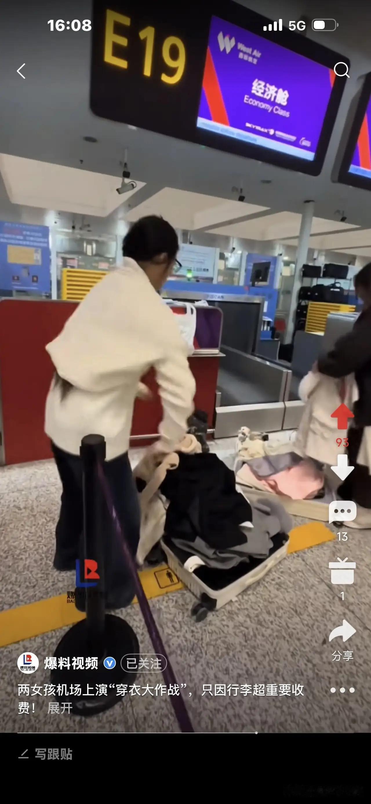 好笑又无奈!两名女孩坐飞机遇行李超重,28公斤要收520元托运费,两人当场开窍,把厚衣服全穿在身上给箱子“瘦身”,场面又滑稽又心酸! 这事发生在12月2日,两名女孩从长春飞往杭州准备跨年旅行。 两人打包了不少厚外套和纪念品,到机场值机时才发现,托运行李足足超重8公斤。 工作人员告知,按航司规定,800公里以上航程现场托运超重部分每公斤收费65元,8公斤总共要付520元。 两人觉得这笔费用太不划算,临时合计出“奇招”,当场打开行李箱,把羽绒服、毛衣等厚衣服一件件往身上套。她们就当着美女工作人员的面,穿毛衣、穿绒衣,套小外套,再套大外套,反正里三层外三层就这么套上,裹得像个粽子一样。 一人硬生生套了3件羽绒服、2件毛衣,胳膊都快抬不起来,夸张的穿着引得周围旅客纷纷拍照,场面十分滑稽。 一番折腾后,行李箱重量刚好达标,两人成功省下520元托运费,只是一路热得满头大汗,直呼“又累又爽”。 网友对此看法不一:有人觉得旅客不该投机取巧,应遵守航司规定,安全第一;也有人认为航司收费过高,现场定价不透明,才倒逼旅客出此下策。 ​