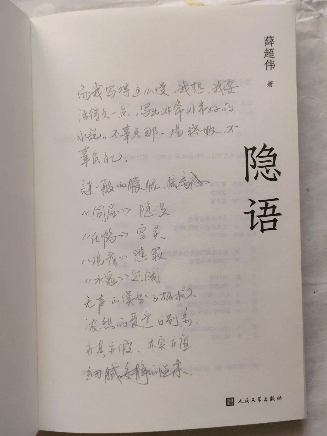 青年作家的作品读过几本,如郭敬明的《梦里花落知多少》、韩寒的《三重门》,觉得蛮有意思;如黎子的《玛瑙纪》、徐畅的《鱼处于陆》,有一些惊喜;近两天读的薛超伟的《隐语》,给了我惊艳和更多惊喜。