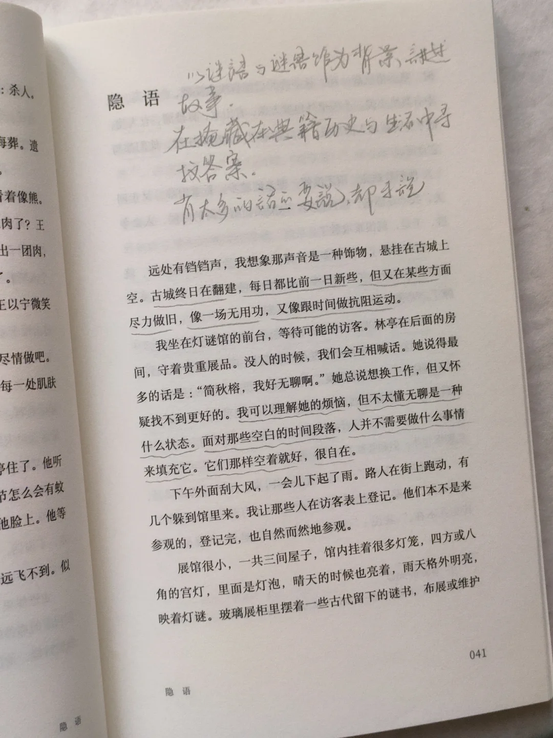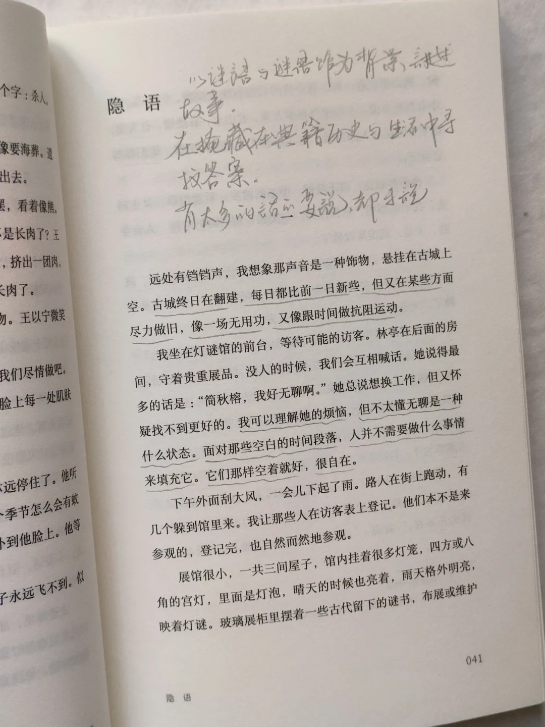 我蕞喜欢《隐语》篇,以谜语为背景的小说,写一个在灯谜馆里工作的女孩。小说中的人物喜欢谜语,而这篇小说本身也是一个谜面。谜一样的吸引了我,让我甚是欢喜。