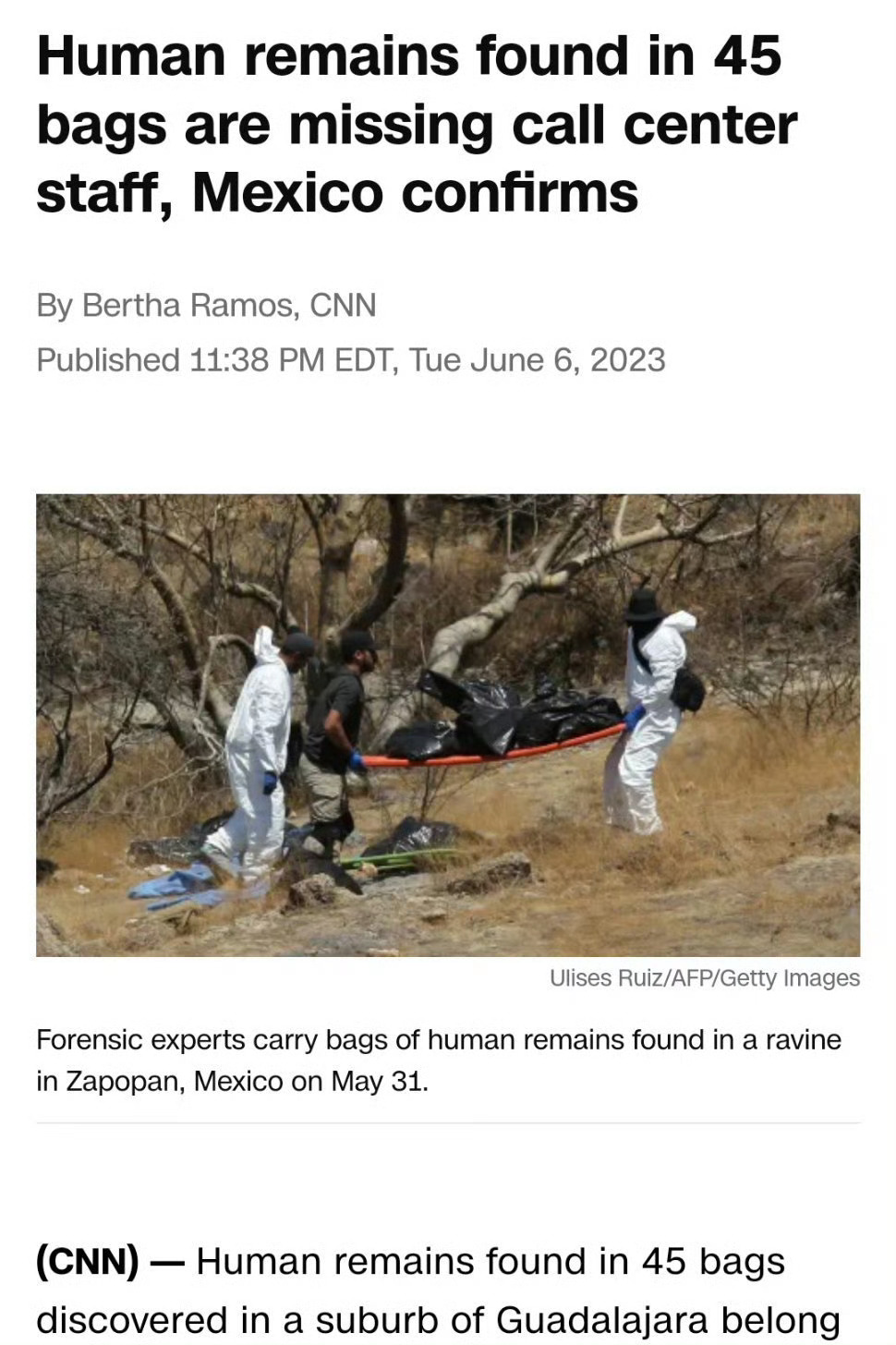 墨西哥一球场附近现456袋人体残骸这是墨西哥大小帮派杀人的传统。即使如此,去墨西哥调研过几天的大V给墨西哥的安全点赞,说很安全。¹ 比如墨西哥第二大城市、哈利斯科州首府Guadalajara市附近山谷,也曾经发现45个人体残骸大塑料袋。注意:是人口失踪查访中心的工作人员!² 黑帮杀人从来不光杀黑帮,当然会殃及平民。此外,毒品犯罪一定伴随其他严重暴力犯罪,所以墨西哥不光毒品泛滥,绑架、贩卖人口和凶杀也是严重的“流行病”。³ 尤其是哈利斯科州(常住人口650万,比浦东新区总人口稍多)。看数据,州失踪人员特别检察官办公室报告:2019年发现291具尸体,2020年发现544具尸体,2021年发现280具尸体,2022年发现301具尸体。2023年上半年,发现147具尸体。热点科普