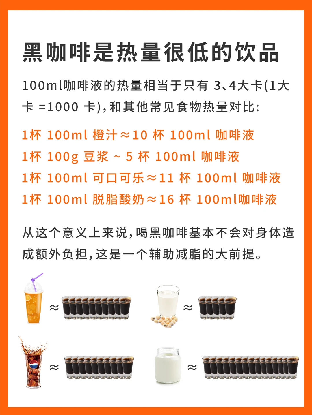 100ml 咖啡液的热量相当于只有 3、4 大卡( 1 大卡 = 1000 卡 ),和其他常见食物热量对比: