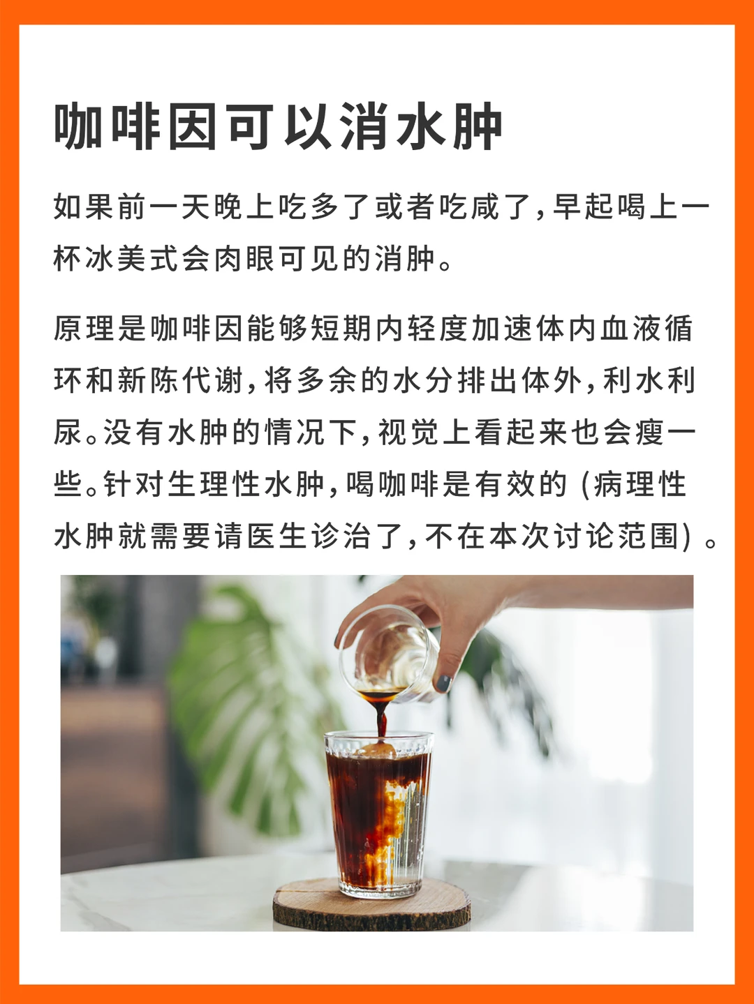 黑咖啡在去水肿这方面也有「奇」效。如果前一天晚上吃多了或者吃咸了,早起喝上一杯冰美式会肉眼可见的消肿。