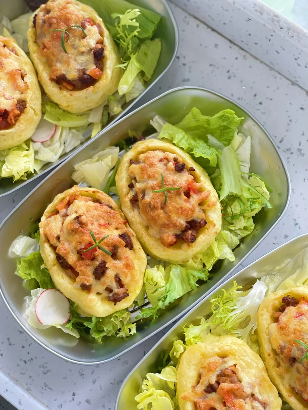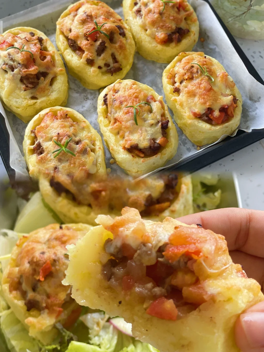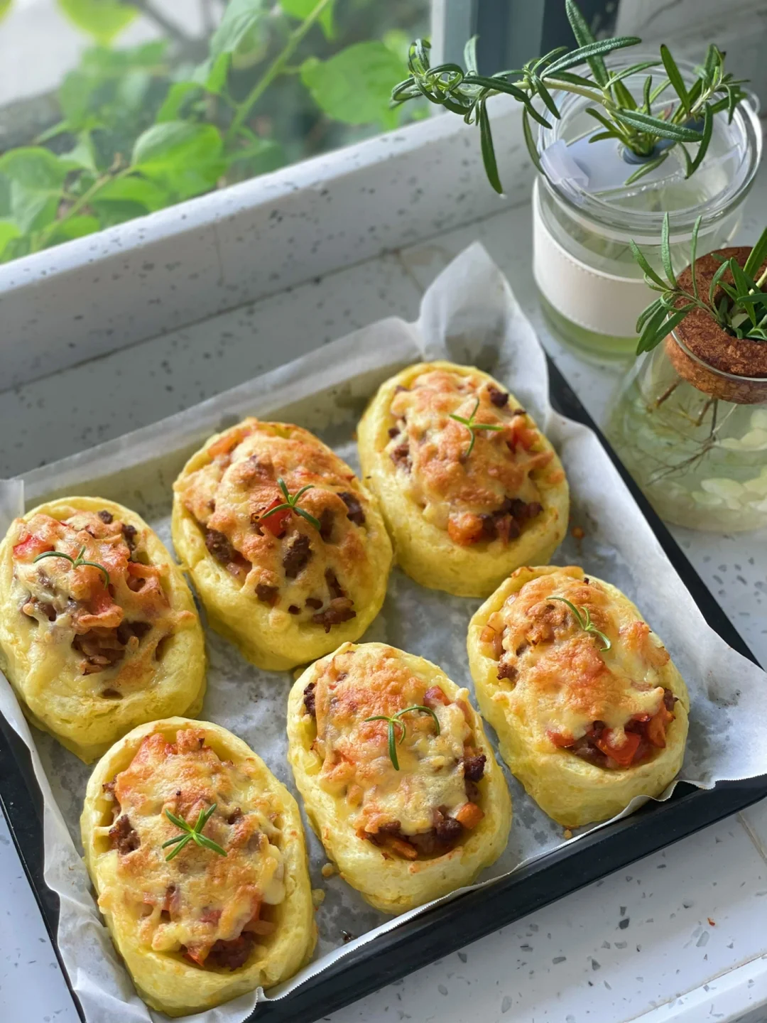 3️⃣炒好的馅料放入烤定型的土豆挞皮上,表面撒马苏里拉芝士,烤箱160度烤12分钟。烤至表面金黄
