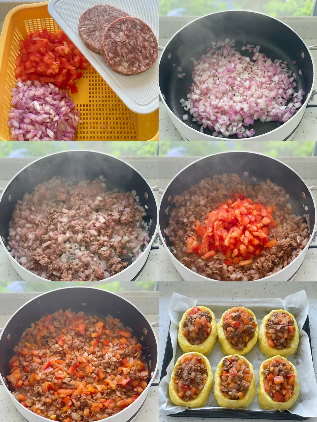 2️⃣锅里放少量油,把洋葱碎炒软。加入牛肉饼炒香,生抽、黑胡椒调味。最后下入西红柿碎拌匀