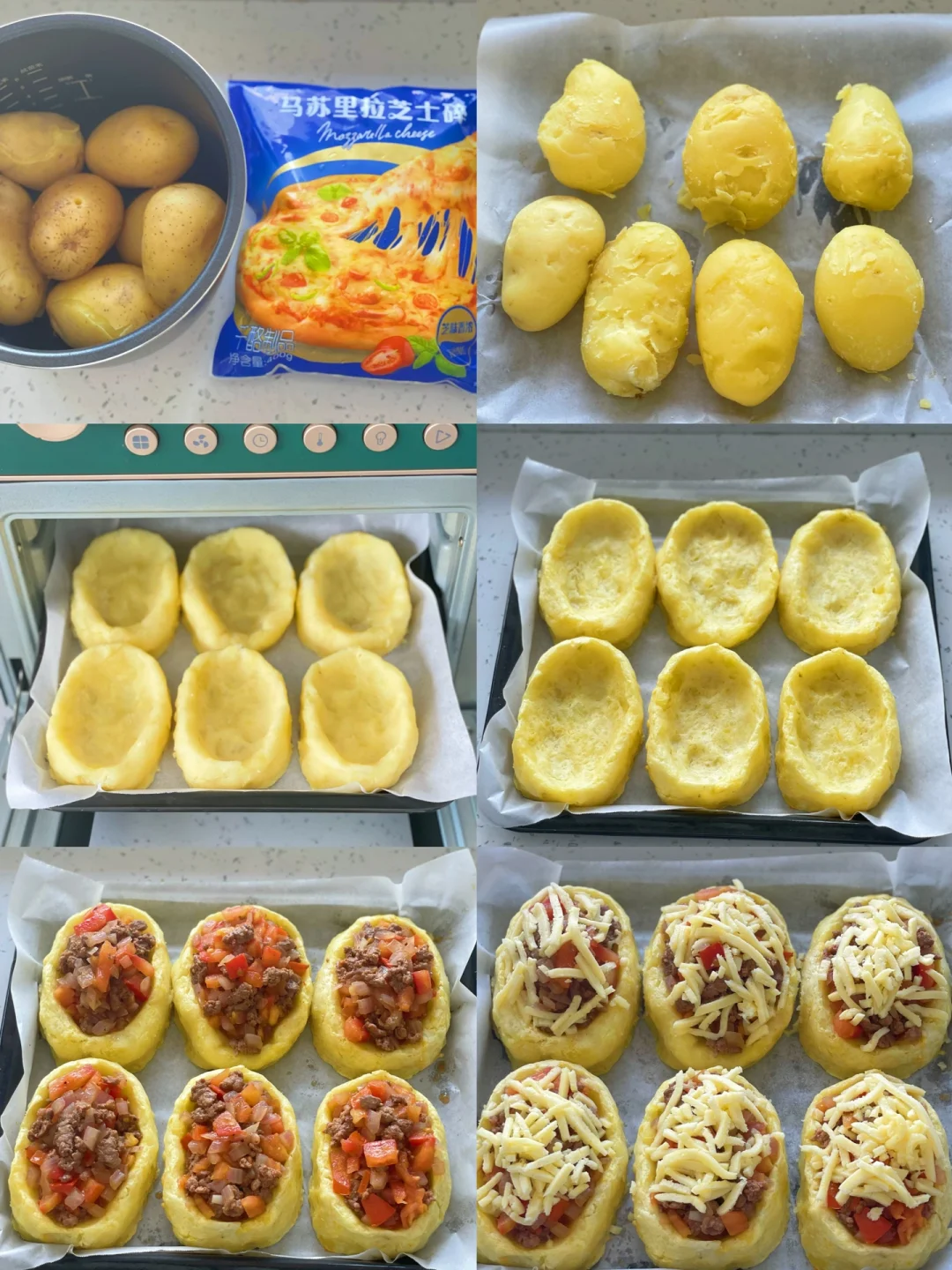 1️⃣土豆蒸熟,压成土豆泥。土豆泥整理成像蛋挞皮一样的形状。烤箱150度,烤15分钟定型