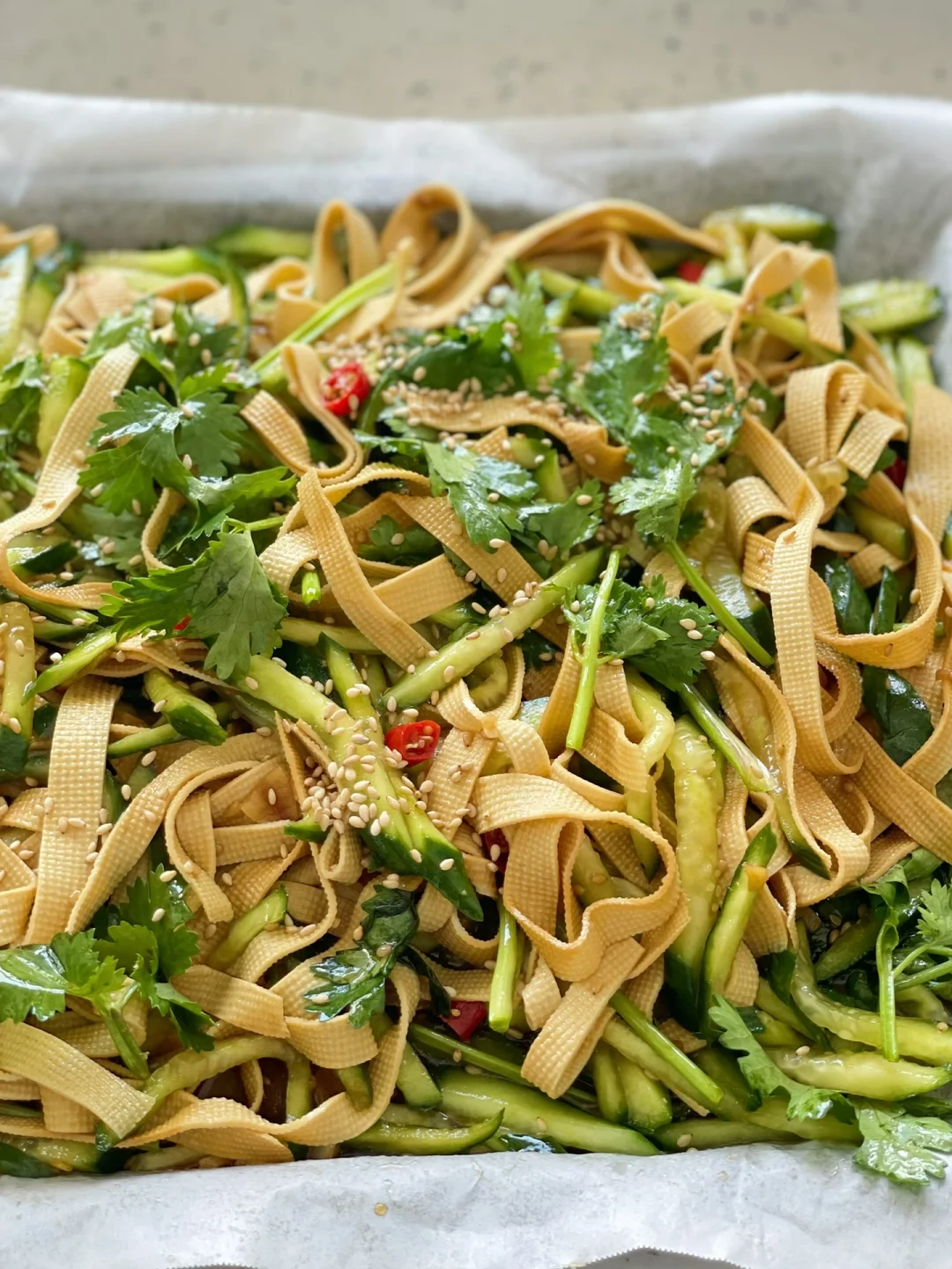 1️⃣黄瓜切丝,用少量盐拌匀。千张切丝在水中烫熟