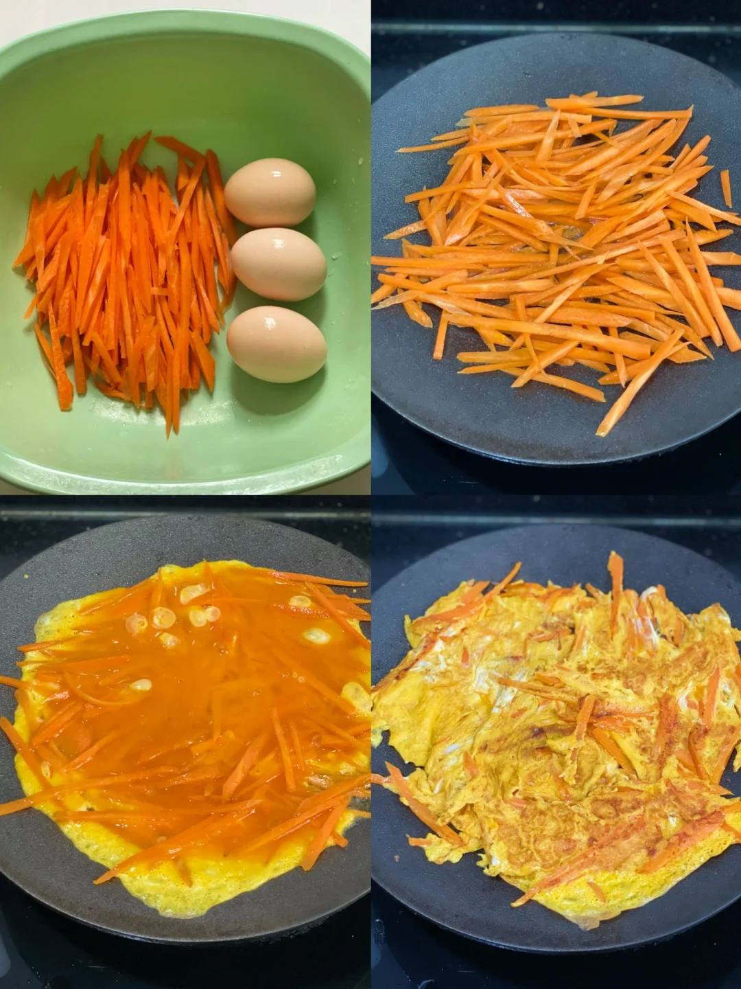 1️⃣胡萝卜切丝、鸡蛋打散放盐调味