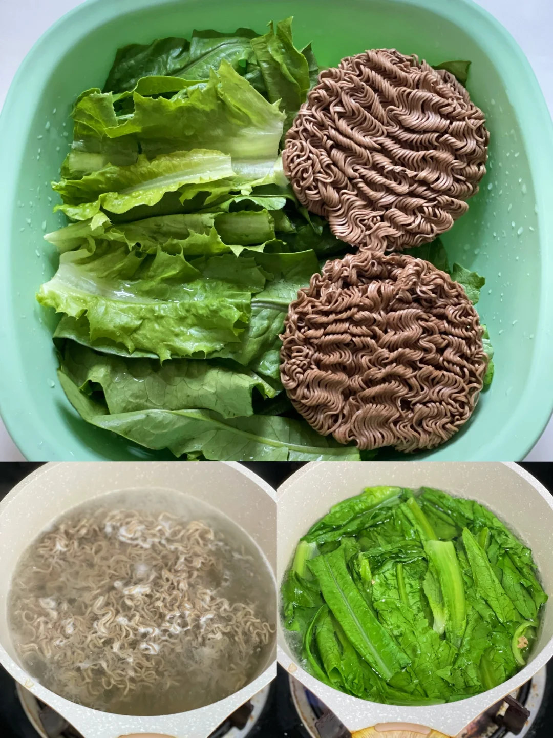 热水烧开,加点盐。面条、油麦菜分别烫熟就好啦!
