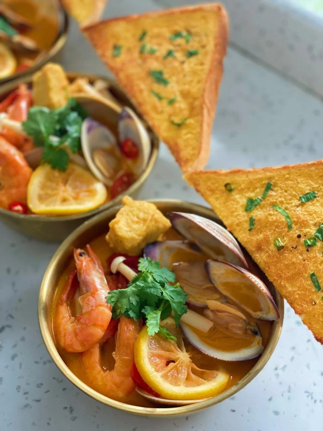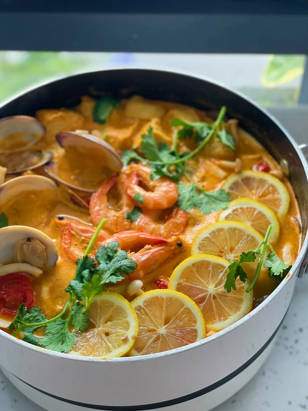 虾|贝壳|秀珍菇|海鲜菇|圣女果|鱼豆腐|香菜|柠檬|小米辣|日食记泰式冬阴功汤底