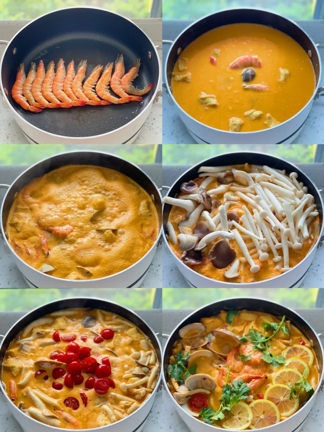 3️⃣冬阴功汤底、贝壳、鱼豆腐一起下入锅中。盖锅盖,煮至汤沸腾