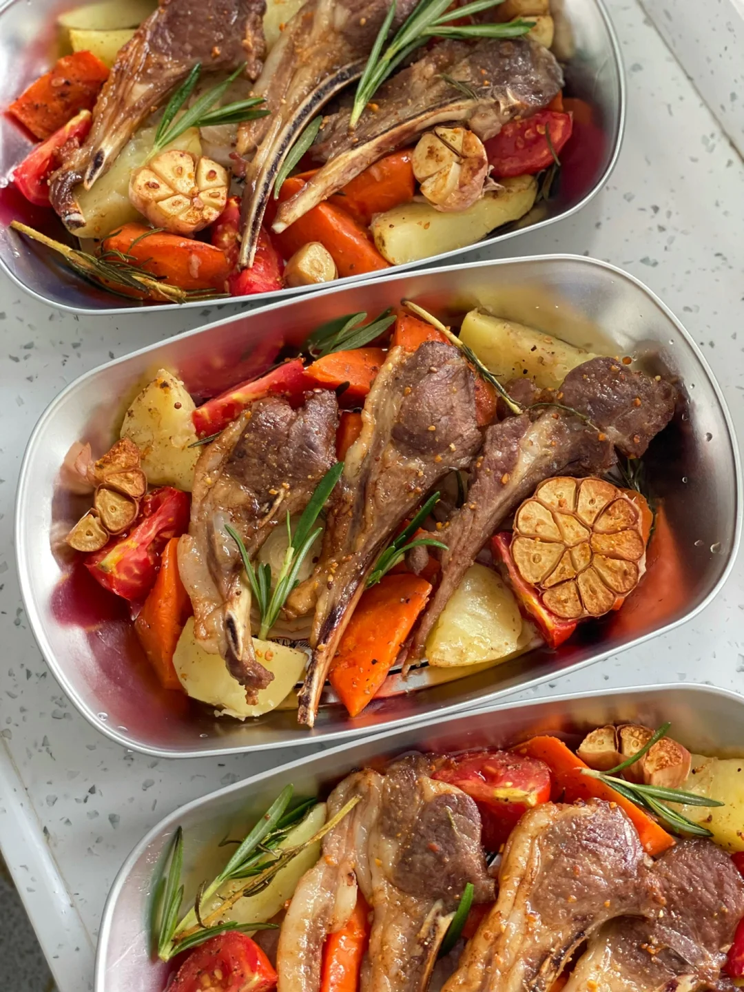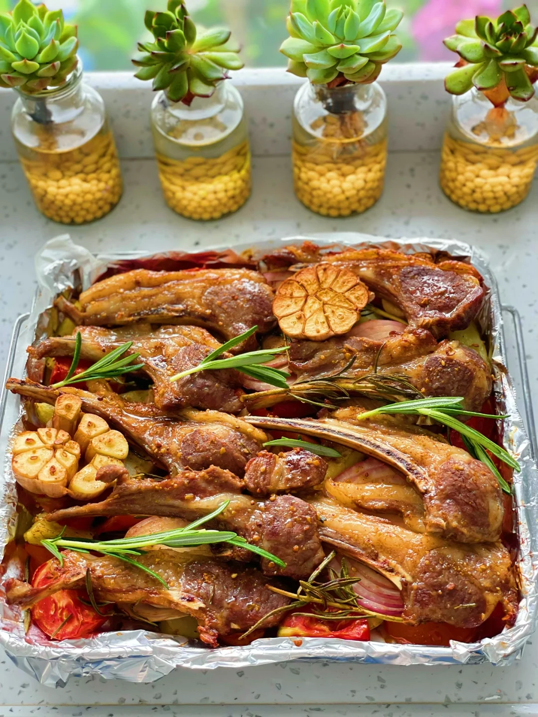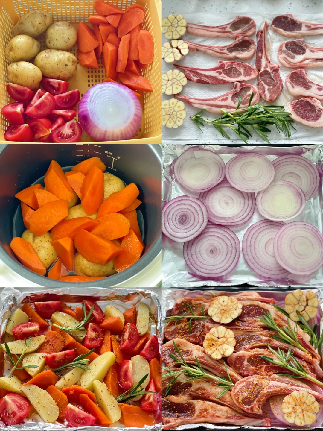 5️⃣蔬菜、洋葱、腌制好的羊排铺好就可以开烤了