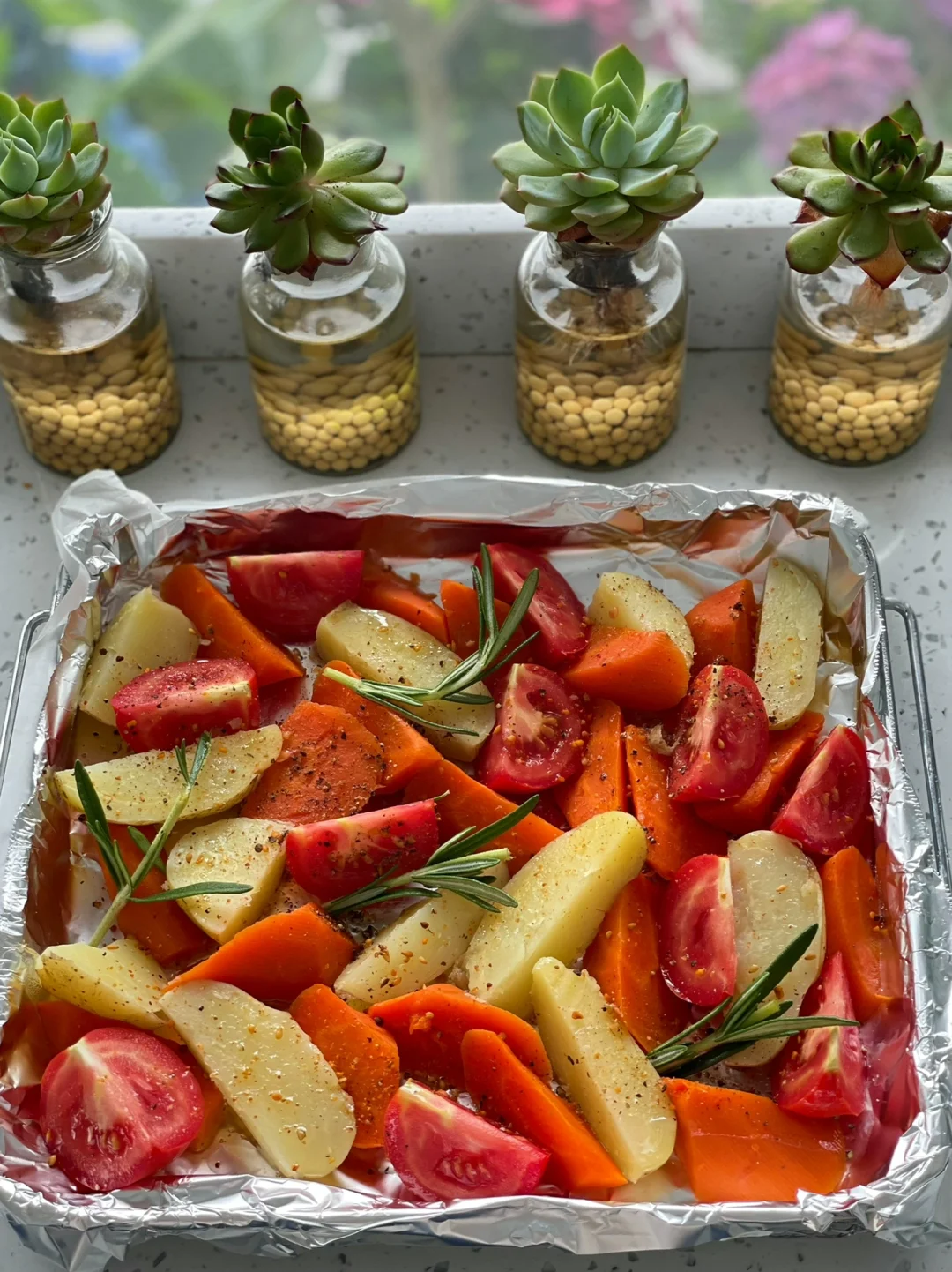 4️⃣煮熟的土豆、胡萝卜,西红柿平铺烤盘上盐、黑胡椒、少量橄榄油拌匀