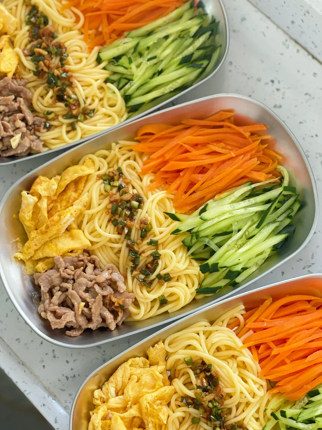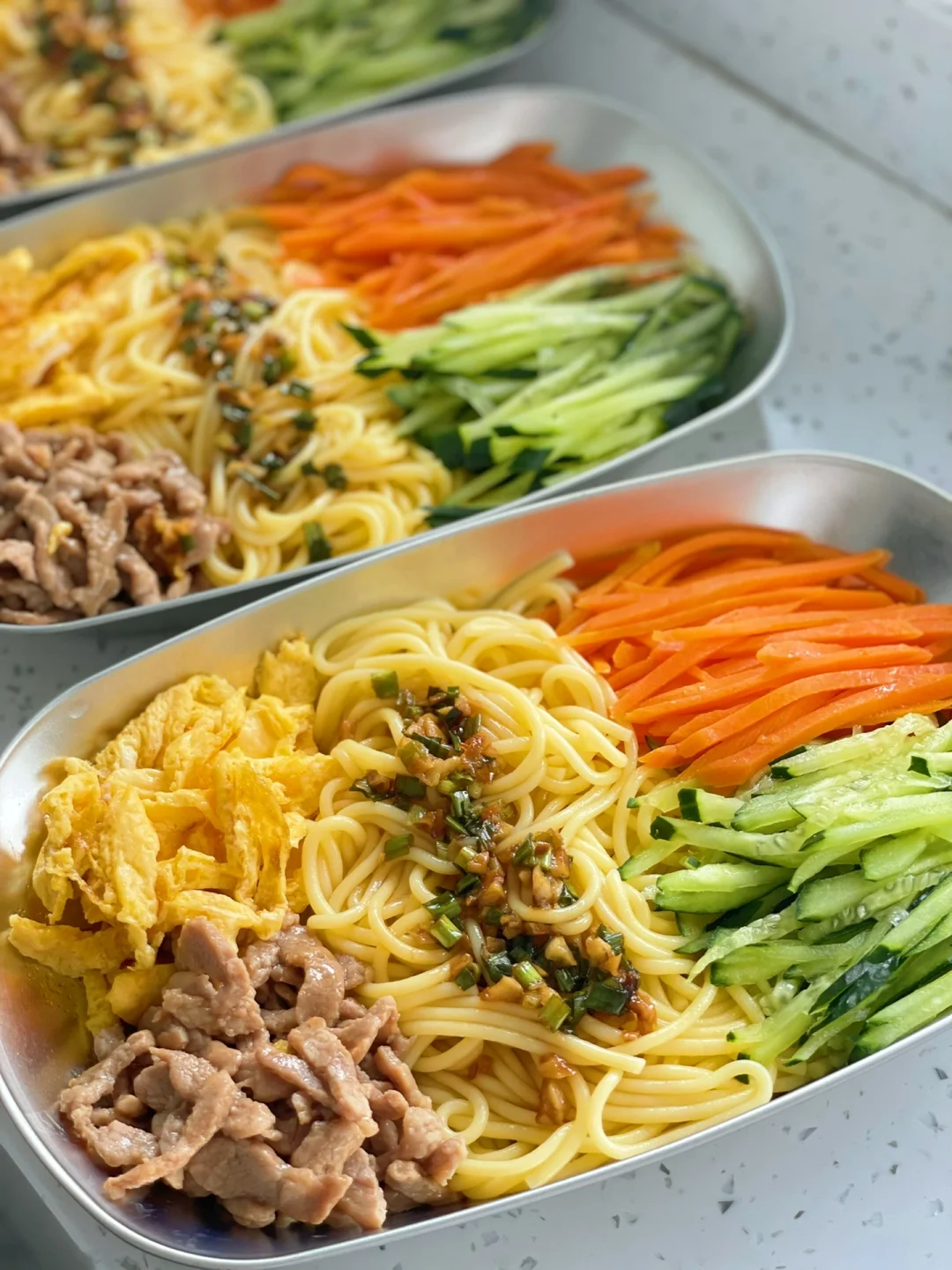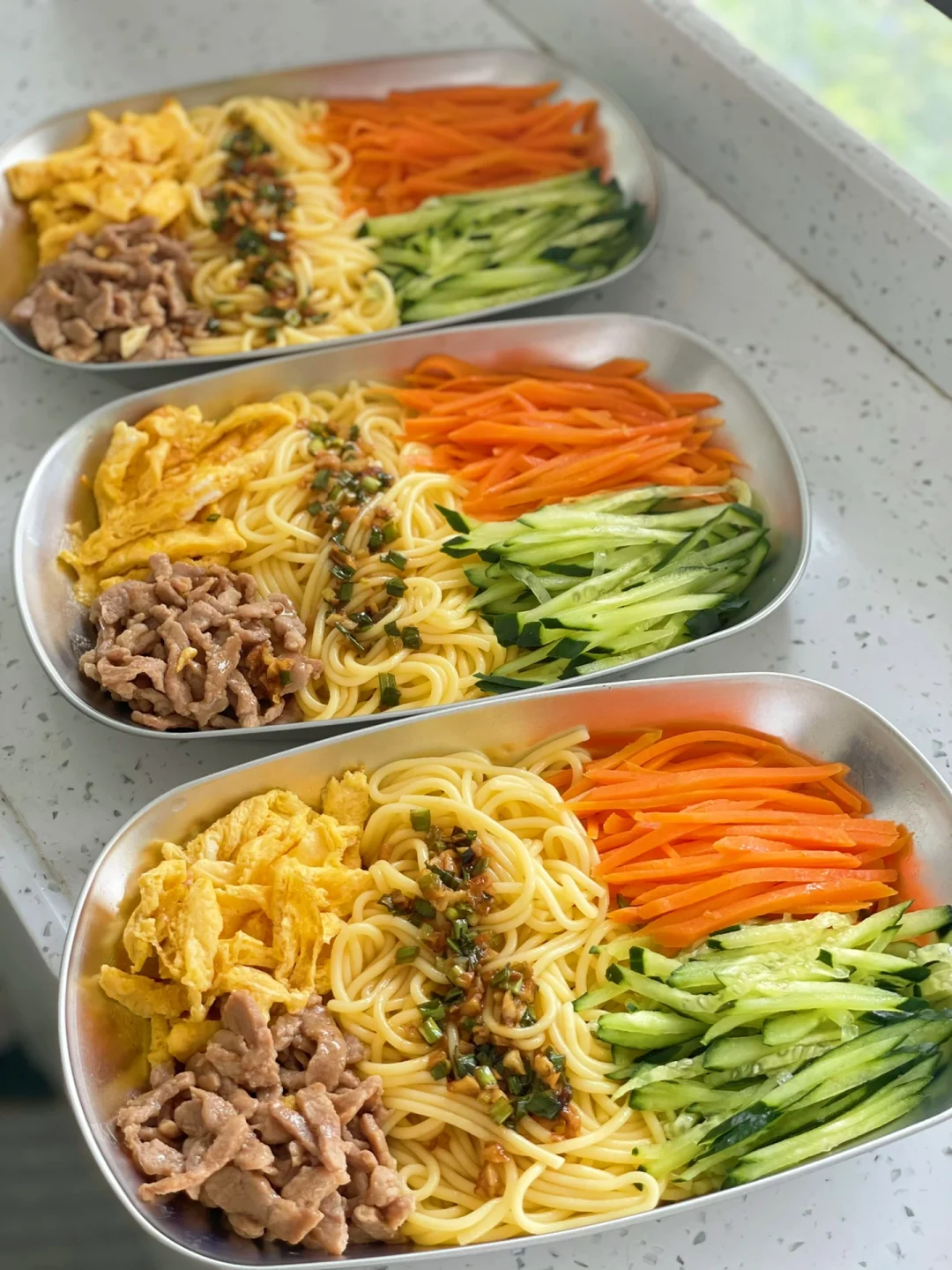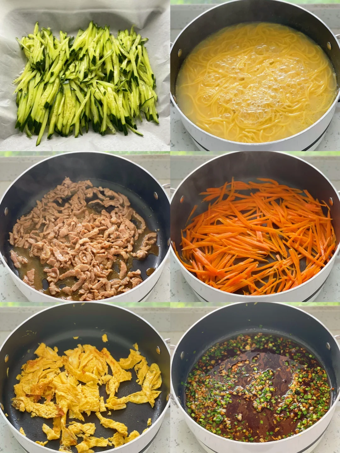 玉米面条|黄瓜|胡萝卜|肉丝|鸡蛋|蒜末|葱|蚝油|生抽|陈醋