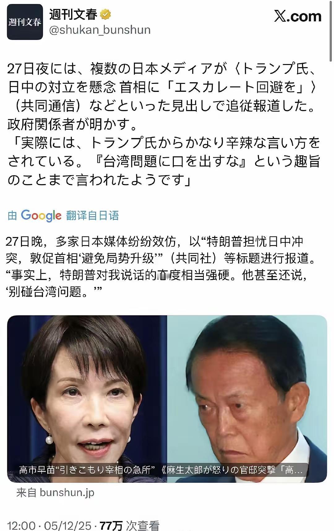高市早苗和特朗普一唱一和,明明是两个商量好的,安排高市早苗跳出来挑衅中国,甚至可以说是向我们宣战,而特朗普硬要装出一副不知情的样子,当然这样子都是给双方留有回旋余地,不至于找不到中间人谈判,高市早苗达到目的后开始逐步认怂,试图缓和局势,我们应该穷追猛打!