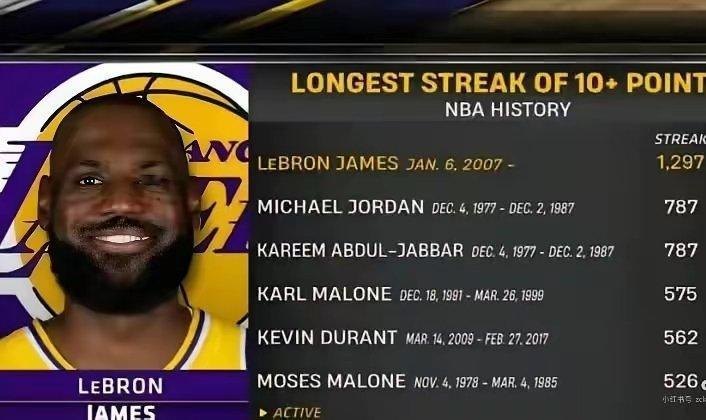 进入历史!詹姆斯1297场连续得分上双记录终结!历经18年,连续1297场得分上