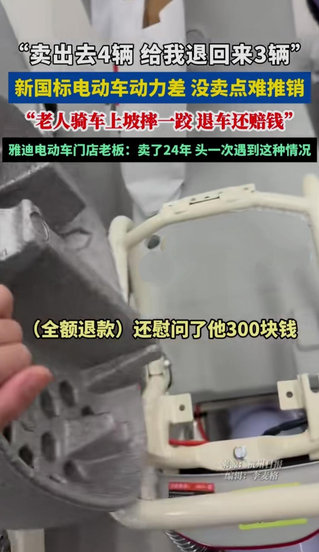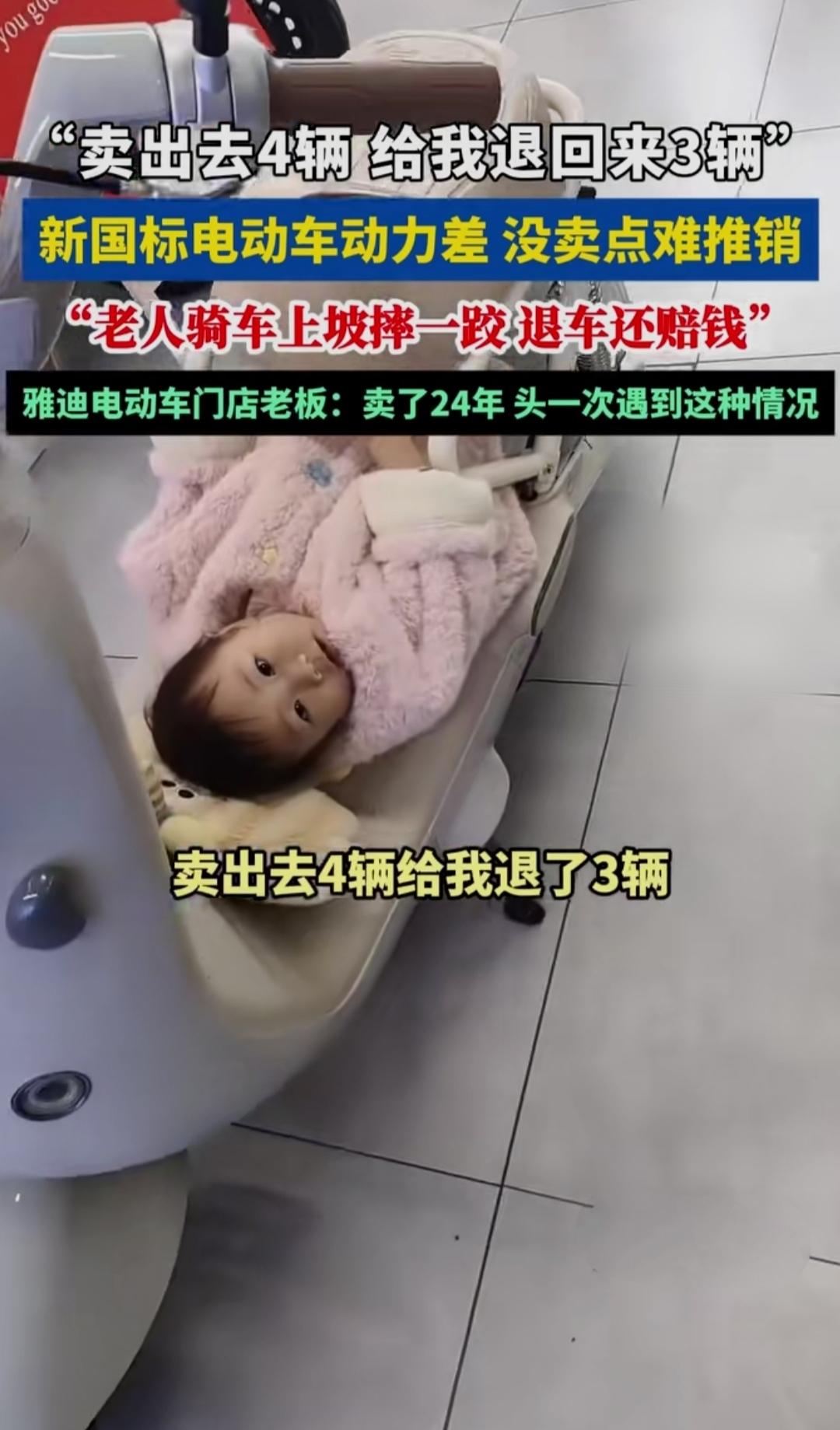 干电动车生意24年,这位雅迪老板最近彻底懵了:进店顾客不少,可卖出4辆电动车,转头就退回3辆。从业这么多年,他从没遇过这么离谱的事儿。 这不是个别门店的难题,而是新国标落地后很多经销商的共同困境。不是老板们不会卖,实在是新国标电动车没了往日卖点,速度慢、续航短,满足不了日常通勤需求。 有个老人买了车,骑上坡时动力不够直接摔了,老板不仅全额退了车,还自掏300块慰问。现在新车连自行车都不如:标着25码实际才20码,年轻人嫌慢扭头就走,老顾客试完直摇头,说还不如旧车能爬坡。年轻人觉得款式太单一,没个性。坚守二十多年的老店,如今靠着维修勉强撑着。 新规的初衷是为了安全,可忽略了用户的实际需求,这才让经销商夹在中间难上加难。希望后续能有更贴合民生的调整,别让这些老店铺寒了心。
