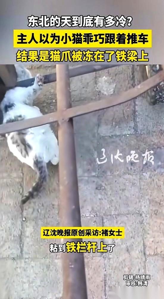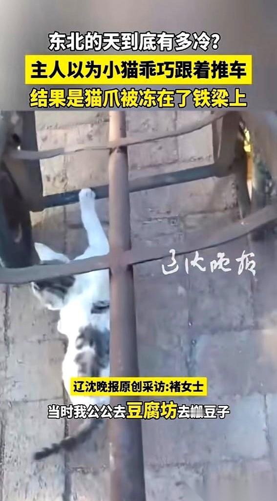 真的,我笑得岔气了。 辽宁一大爷,推着个小车去拉豆子,他家那小猫就趴在车把上。 大爷一推车,嘿,猫也跟着“走”,俩爪子扒着冰凉的铁栏杆,身子都快拉成一条线了。 大爷那个自豪啊,逢人就夸: “瞅瞅!瞅瞅我家这猫!都成精了!知道心疼人,帮我推车呢!” 那画面,要多感人有多感人。 一个慈祥的老人,一只“懂事”的猫咪,夕阳下,一人一猫,共同奋斗…… 结果呢? 停下来才发现真相。 哪是猫懂事啊,是天太冷,猫爪子沾了水,给活活冻在铁栏杆上了! 猫都快被拉断了,疼得估计直想骂娘,大爷还搁那儿感动呢。 这真是应了那句话: 人家都要上吊了,你还以为人家在荡秋千呢。 东北的冬天,你永远不知道下一个段子是什么。 心疼猫咪三秒钟,然后让我再笑一会儿。 这哪是“被迫营业”啊,这妥妥的工伤啊朋友们!