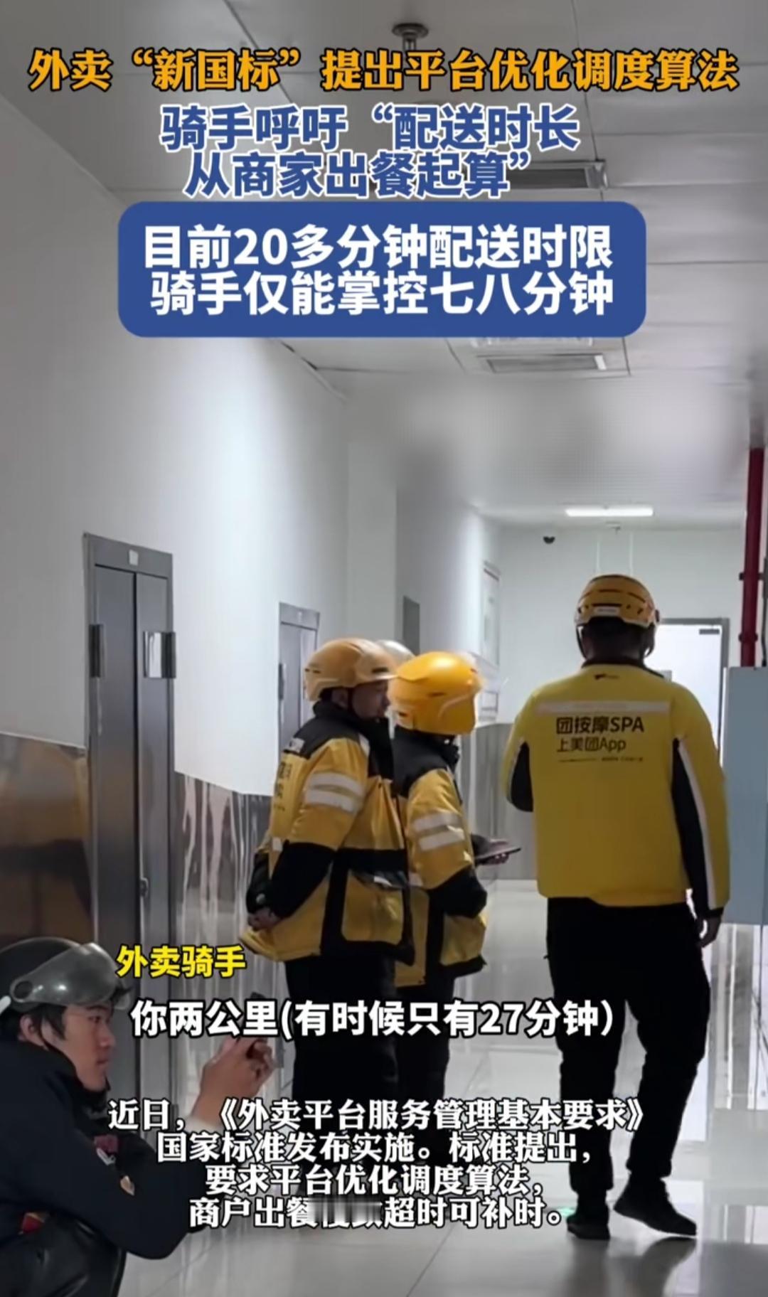 外卖新国标终于来了!本以为骑手们总算能告别拿命送餐的日子,结果仔细一看细则,这槽点简直能从早说到晚。 新规说要优化算法,算路况、算天气、算爬楼时间,听起来特贴心。可现实是啥?平台还按老规矩卡时限,商户出餐慢耽误半小时,超时账照样算在骑手头上,所谓“补时”根本申请不下来。 更离谱的是配送时速限15公里,城里堵车、小区找不到楼栋,这些都不算缓冲。以前是怕超时扣钱,现在是怕限速被罚,骑手照样得在车流里提心吊胆。 说好的保障权益,怎么越看越像“纸面福利”?别光搞些花架子规则,倒是实地跟一天单试试,骑手要的不是口号,是能落地的实在保障啊!