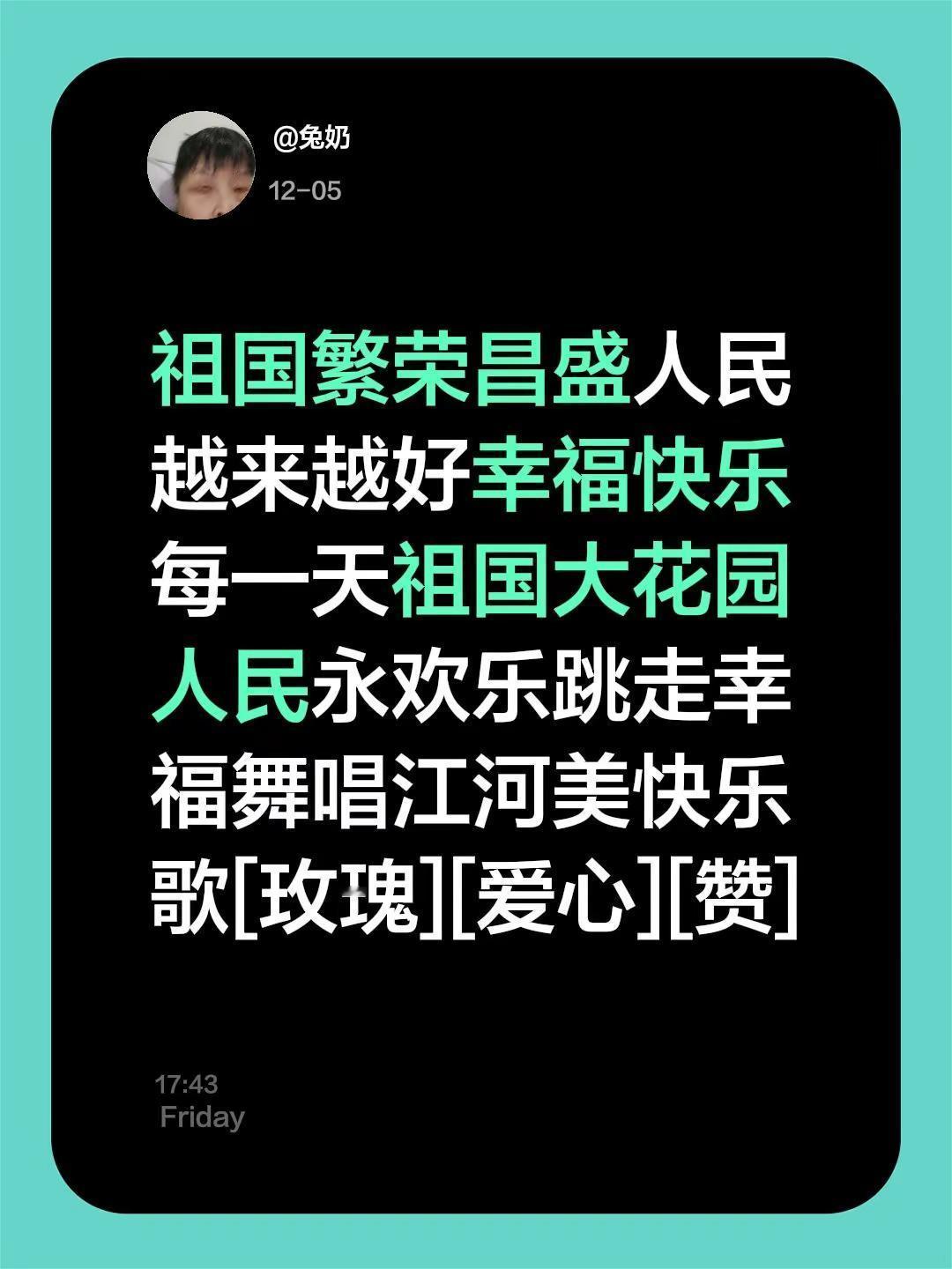 我评论了@王孝山 的作品:祖国繁荣昌盛人民越来越好幸福快乐每一天祖国大花园人民永欢乐跳走幸福舞唱江河美快乐歌[玫瑰][心][赞]