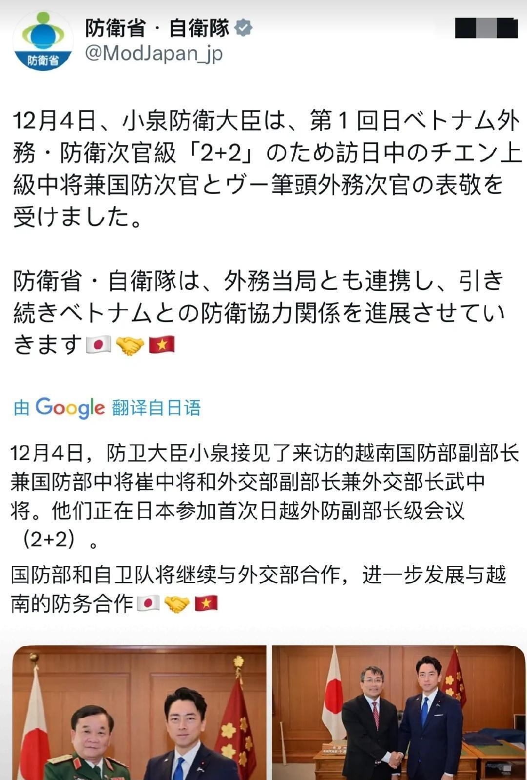 是不是急了点?日本防卫省自卫队官方账号今天(12月4日)发文写到:12月4日,防卫大臣小泉会见了越南外交部、国防部副部长,他们正在日本参加日越首次外交、防务副部长级2+2会议。 这场标注着“首次”的双边会议,将日本与越南的防务合作推到台前。 双方在会谈中频繁翻阅合作文件,小泉手中的钢笔在笔记本上划出连续的折线,似乎在强调某种紧迫性。 越南代表则不时抬头观察日方表情,桌面上的咖啡杯始终未动——这场对话从一开始就弥漫着微妙的张力。 防卫省随后表态,将联合外交部“进一步发展与越南的防务合作”,软件翻译的措辞虽显生硬,却清晰传递出信号。 东方时评提醒的“首次”二字,像一根刺扎在地区安全的图谱上。 这真的只是一次常规的外交互动吗? 有人说越南或许只是想拓展安全选项,毕竟经济合作才是其核心诉求——但在高市早苗“搞事”风波余波未平之际,选择此时与日本深化防务联系,时机的选择本身就值得推敲。 日本近期在地区事务中动作频频,从黄循财访问后的舆论引导,到李在明下月将赴奈良的行程安排,都在编织一张以“安全合作”为名的网络。 越南此刻的加入,与其说是战略自主,不如说是在大国博弈中寻求短期支点——这种“随风舞动”的姿态,早在南海问题的摇摆中就已显露端倪。 更值得警惕的是巴基斯坦新任驻日大使的公开表态,“希望建立更密切关系”的背后,是日本试图突破战后秩序、扩大军事存在的又一注脚。 当“朋友圈”的边界不断模糊,那些看似“心猿意马”的伙伴,实则是在测试地区力量的平衡点。 我们不必急于定义谁是“真朋友”,谁是“墙头草”。 时间会让每一次“首次”会议露出底色,就像小泉笔记本上那些折线,终究会连成一张清晰的意图图谱。