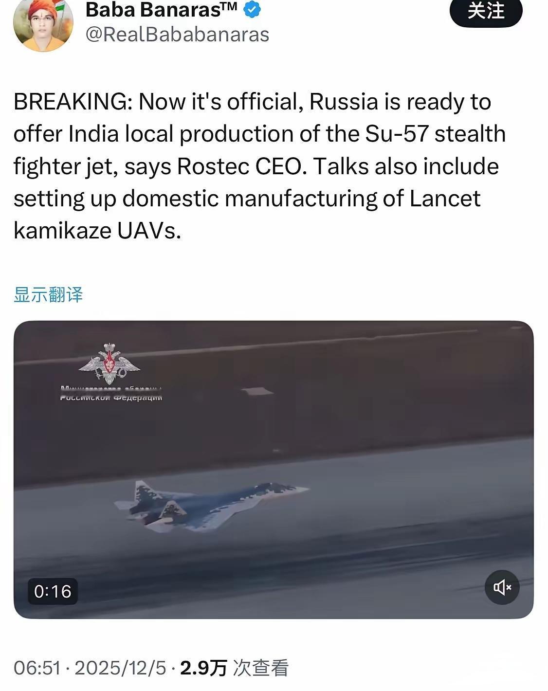 浪子野心,这是背刺谁呢? 突发新闻:俄罗斯国家技术集团公司(Rostec State Corporation)CEO谢尔盖·切梅佐夫 (Sergey Chemezov)表示,俄罗斯已正式准备向印度提供苏-57隐形战斗机的本地化生产。谈判内容还包括在印度建立“柳叶刀”自杀式无人机的本土生产线。