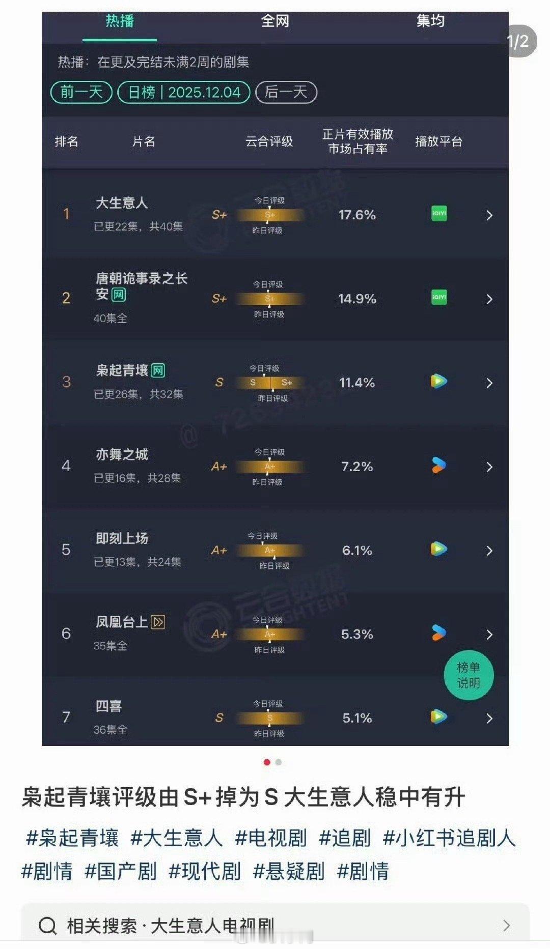 迪丽热巴枭起青壤降级 尴尬了~没想到迪丽热巴的新剧《枭起青壤》刚开分,连评级也掉了啊。居然从s+变成 s了,同期开播的《大生意人》在开分后云合占比还在上升,就是说热巴还能靠这部剧飞升嘛~迪丽热巴枭起青壤评级掉了