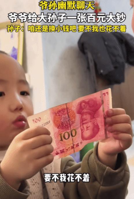 “笑不活了!”黑龙江,爷爷给大孙子一百元大钞。突然大孙子说:“你给我换成小钱吧,要不我也花不着。”爷爷又跟大孙子说:“爷爷没有零钱了。”结果大孙子说:“你也没诚心给呀,要不你直接给我妈妈吧!” 隆冬的黑龙江,一户普通民居的客厅里暖意融融,爷爷坐在铺着棉垫的木沙发上,慢悠悠地从棉袄内侧的口袋里掏出一个塑封的小钱包。 指尖捻出一张崭新的百元大钞,朝着正蹲在地上玩积木的大孙子扬了扬手,听到爷爷的招呼,小男孩立刻丢下积木跑过来,乌黑的眼睛里满是期待。 他双手接过那张红彤彤的钞票,手指捏着钞票的边角反复摩挲,原本上扬的嘴角却渐渐抿紧,小眉头也慢慢拧成了一个疙瘩。 片刻后,他捧着钞票递回给爷爷,小脑袋微微仰着,脸上带着几分认真的困惑。 爷爷看着孙子反常的举动,先是愣了一下,随即爽朗地笑起来,伸手揉了揉孩子的头发,摆了摆手示意自己没有零钱。 如今街头的小卖店都挂着扫码支付的牌子,现金交易本就少见,更别说凑齐九十元零钱。 让爷爷没想到的是,孩子听完后轻轻“哦”了一声,转身就往厨房方向走,嘴里还小声念叨着什么,直到走到正在择菜的妈妈身边,才把钞票塞了过去。 这一幕被一旁玩手机的爸爸看在眼里,觉得格外有趣,他放下手机凑过去,故意对着孩子眨了眨眼,做出一副“交易”的手势,示意要用五十元换孩子手里的百元大钞。 孩子扭头瞥了爸爸一眼,先是皱起鼻子,接着往后退了一步,身体微微侧着避开爸爸的手,脸上写满了明显的嫌弃,脚步不停往爷爷身边挪。 跑到爷爷跟前,孩子干脆爬上沙发,小手拉着爷爷的袖口,一本正经地说起了“建议”。 他先是指了指不远处还在笑的爸爸,又拍了拍爷爷的手背,意思是让爷爷以后给钱分两份,话里话外都透着对爸爸“经济状况”的担忧。 说完这话,他还特意挺了挺小胸脯,竖起大拇指朝着爷爷晃了晃,眼神里满是崇拜,在孩子眼里,不用扫码、能直接拿出百元大钞的爷爷,显然是家里“财务最自由”的人。 孩子这番超出年龄的通透话,让原本笑着的爸爸瞬间红了脸,赶紧用手捂住脸,肩膀却忍不住微微发抖。 家里人随手把这段日常拍下来发到网上,没成想很快就引发了全网的共鸣。 评论区里,无数网友晒出了自家孩子的“同款经历”:有人说自家侄女看到百元大钞就摆手,只肯要十块钱的零钱。 有人回忆自己小时候,压岁钱刚揣进兜就被妈妈以“保管”的名义收走,最后只换来几块钱零花钱,这些细碎的回忆里,藏着几代人共通的童年印记。 但其实长辈对孩子的疼爱从来都没错,只是很多时候,这份爱选了错误的表达方式。 与其给孩子一张他们握不住的大额钞票,不如带他们去挑选一件心仪的小礼物;与其用“保管”的名义收走孩子的压岁钱,不如给他们留一笔能自由支配的小额零钱。 真正的疼爱,从来不是“我想给你什么”,而是“你需要什么”;不是用金钱的数额彰显分量,而是让孩子在被理解中感受到温暖。