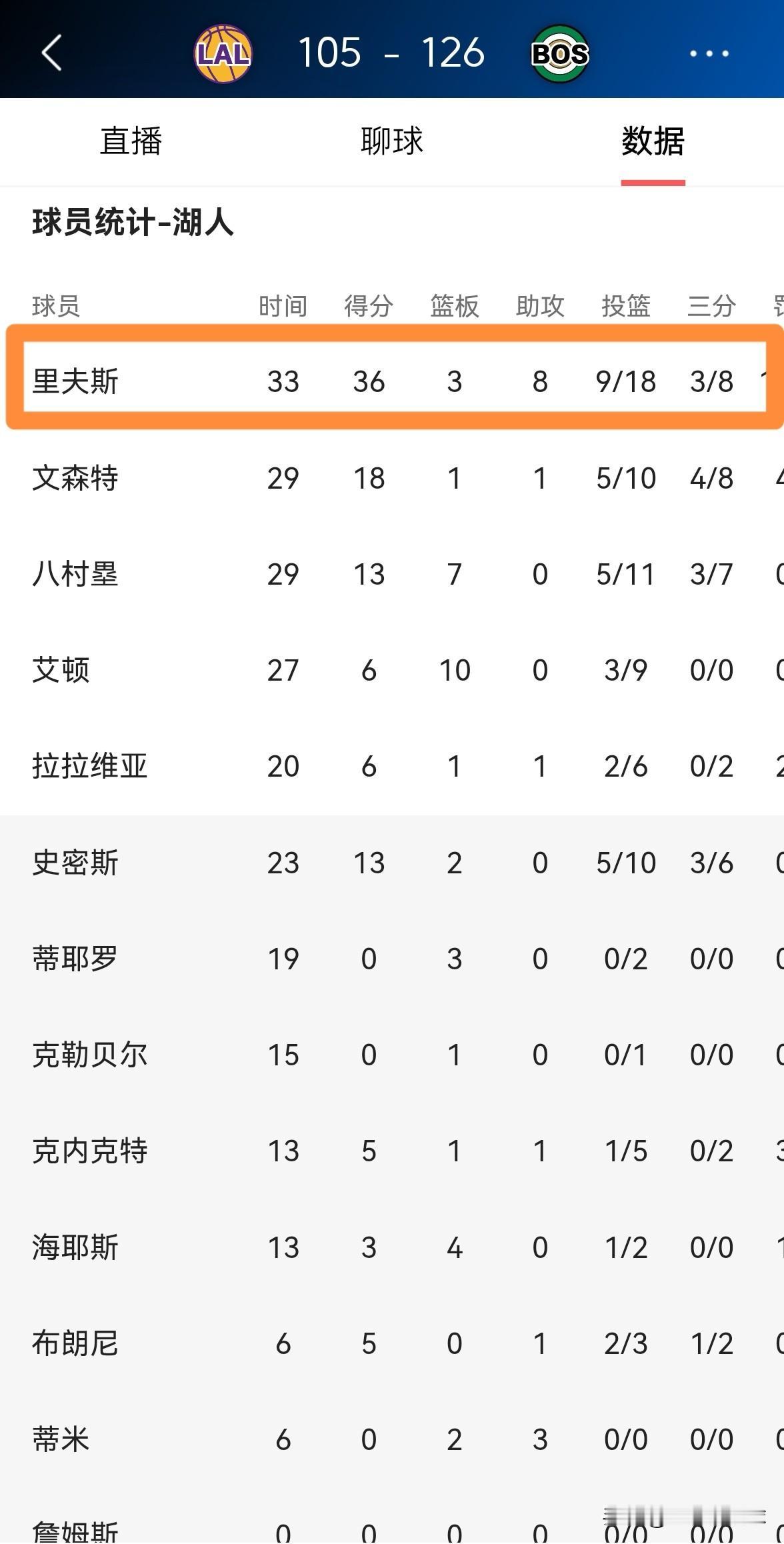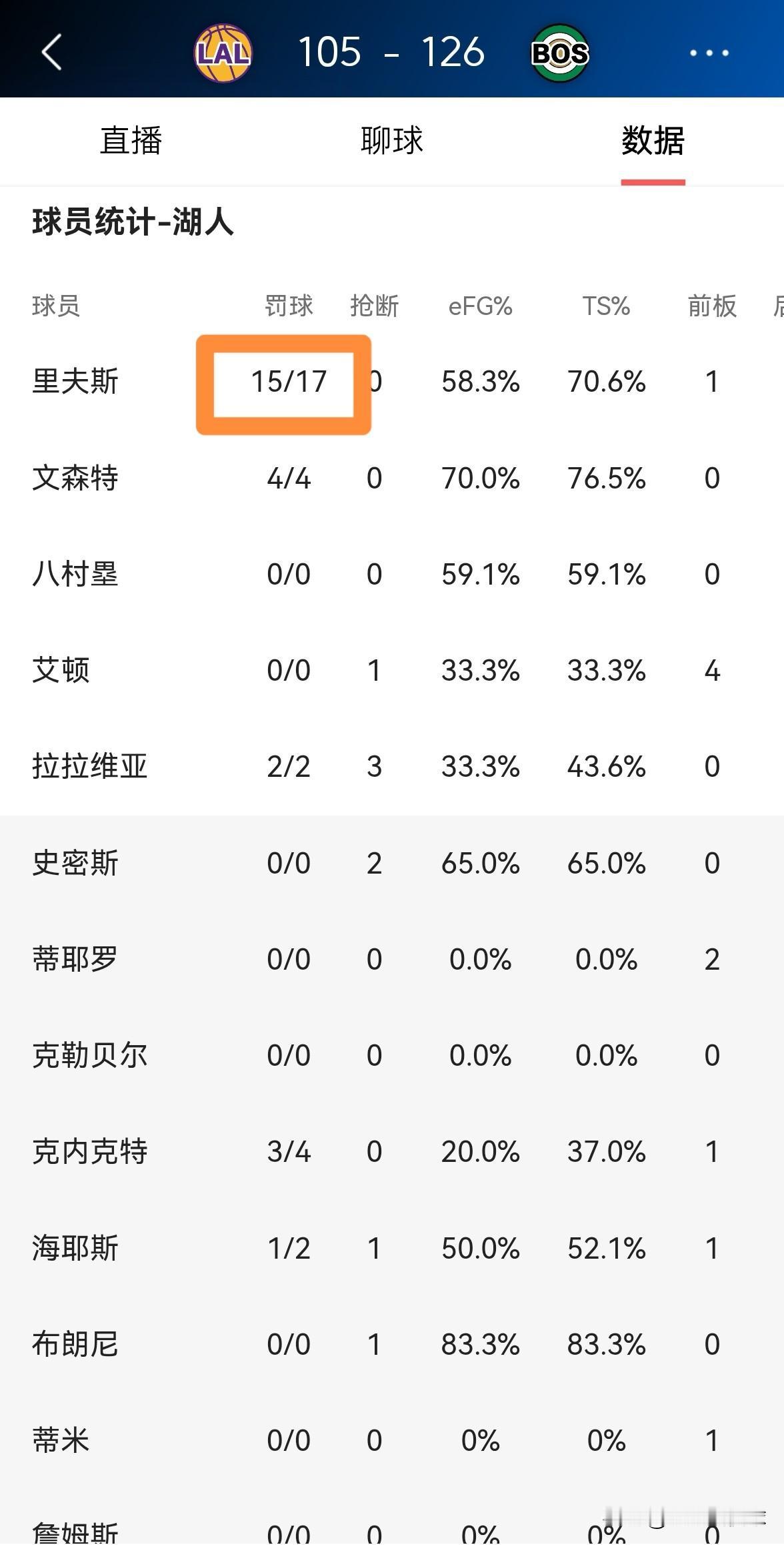 湖人超级后卫里弗斯真是一台罚球机器!在今天湖人客场以105:126惨败于凯尔特人的比赛中,里弗斯疯狂的获得了17次罚球。 全场比赛下来,里弗斯首发出战33分钟,投篮18中9,其中三分球8中3、罚球17中15砍下36分3篮板8助攻,他的场上正负值为-9。 毫不夸张的说,如今的里弗斯已经成为了当今联盟造犯规能力最强的球员之一,他已经能够和雷霆巨星亚历山大相提并论了。