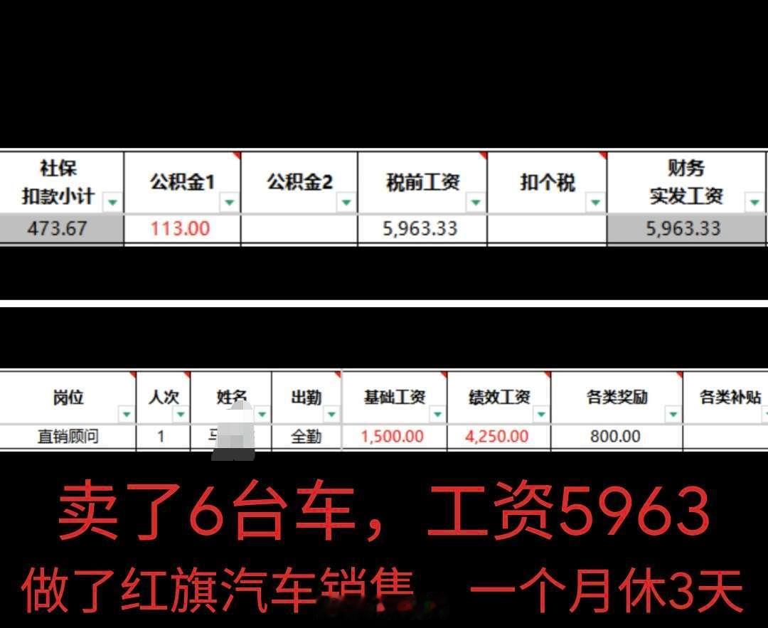某红旗销售,底薪1500,单车500-800提成,月休三天税后6000。在业内算